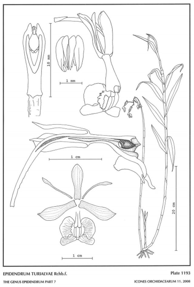 References W3 Tropicos, Kew Monocot list , IPNI ; *Gard. Chron. 1871: 1678. 1871; Repert. Sp. Nov. Regni. Veg. Beih. 17: 42. Panama Schlechter 1922 mis-spelled as E turialbae; Repert. Sp. Nov. Regni. Veg. Beih. 19: 129. Costa Rica Schlechter 1923; Icones Planetarum Tropicarum Plate 742 Hamer 1982 drawing fide; Selbyana Vol 10 Orchids of Central America Hamer 1988 drawing fide; Orchids Travel By Air A Pictoral Safari Mulder, Mulder-Roelfsema and Schuiteman 1990 photo fide; Icones Orchidacearum 2 Plate 108 Hagsater 1993 see recognition section; Icones Orchidacearum 2 Plate 181 Hagsater & Sanchez 1993 see recognition section; Icones Orchidacearum 2 Plate 196 Hagsater 1993 see recognition section; Icones Orchidacearum 3 Plate 307 Hagsater 1999 see recognition section; Icones Orchidacearum 3 Plate 384 Hagsater 1999 see recognition section; Icones Orchidacearum 3 Plate 398 Hagsater 1999 see recognition section; Icones Orchidacearum 4 Plate 446 Hagsater 2001 see recognition section; Manual de las Plantas de Costa Rica Vol 3 Hammel, Grayum, Herrera and Zamora 2003; Vanishing Beauty, Native Costa Rican Orchids Vol 1 Pupulin 2005 photo fide; Icones Orchidacearum 11 Plate 1131 Hagsater 2008 see recognition section; Icones Orchidacearum Vol 11 Plate 1193 Hagsater & Sanchez 2008 drawing fide; Orchids of Costa Rica Vol 3 Morales 2009 photo fide; Icones Orchidacearum 14 Plate 1427 Hagsater & Santiago 2013 See recognition section; Icones Orchidacearum 14 Plate 1463 Hagsater & Sanchez 2013 see recognition section; Icones Orchidacearum 15 [1] Plate 1567 Hagsater & Sanchez 2015 see recognition section;