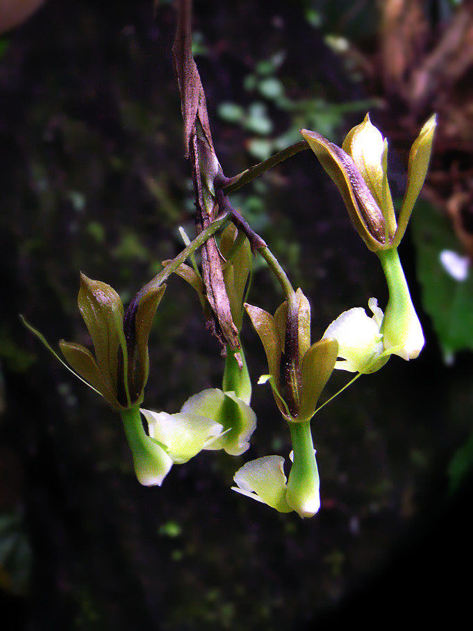 Found in Nicaragua and Costa Rica at elevations of 200 to 1400 meters as a medium sized, hot to cool growing epiphyte with erect, rigid, cane-like stems carrying in the apical half, narrow, lanceolate, long-acuminate leaves and blooms at most any time of the year on a terminal, long-peduculate, 1 to 4 flowered, racemose inflorescence that can rebloom over several seasons from a different node and has simultaneously opening flowers.