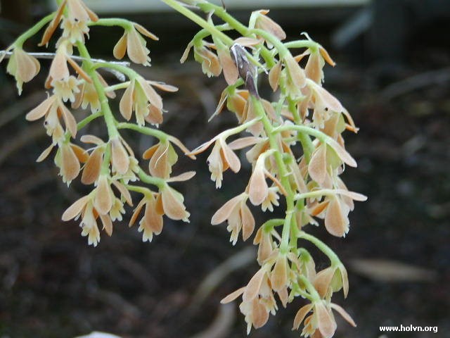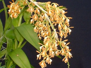 Found in Vera Cruz and Oaxaca states of Mexico on the gulf slope in tropical montane, deciduous and rain forests at elevations of 1300 to 1700 as a medium to giant sized, cool growing epiphyte with simple, basally terete, mid way laterally compressed, cane-like stems enveloped completely by old leafless sheaths and carrying in the upper half, 5 to 18, sub-coriaceous, narrowly elliptic to lanceolate, shortly acuminate, basally clasping leaves articulate to the sheaths that blooms in the late spring through early fall on a terminal, pluri-racemose, compact and dense, many flowered inflorescence that can rebloom over the years and carrying 20 to 32, simultaneously opening seminally fragrant flowers.