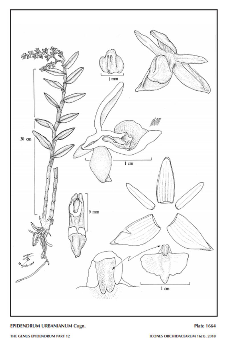 "Epidendrum urbanianum belongs to the GROUP Aquaticum which is characterized by the monopodial, branching habit, the distichous, erect inflorescence, with fleshy flowers, and the disc of the lip and/or nectary often pilose. The species is recognized by the sinuous rachis and the floral bracts nearly as long as the flower .2 to .48" [5.0 to 12 x 7.0 to 10 mm], oblong-lanceolate leaves 1 to 3.8" x .4 to .8" [2.5 to 9.5 x 1.0 to 2.0 cm], sepals .28 to .4" [7.0 to 10 x 2.5 to 4.5 mm] long, petals linear, .22 to .28" x .4 to .6" [5.5 to 7.0 x 1.0 to 1.5 mm], and the column geniculate with respect to the ovary, forming a 90° angle, and lip with a single, small callus, the apex bilobed. Epidendrum reclinatum Carnevali & I.Ramírez has lanceolate leaves 1.4 to 2" x .32 to .44" [3.5 to 5.0 x 0.8 to 1.1 cm], the inflorescence erect to slightly arching, the rachis straight, floral bracts prominent but never as long as the flower, .24 to .28" x .12 to .2" [6.0 to 7.0 x 3.0 to 5.0 mm], sepals .28 to .32" [7.0 to 8.0 mm] long, petals narrowly spatulate, .26 to .32" x .084 to .104" [6.5 to 8.0 x 2.1 to 2.6 mm]. Epidendrum alsum Ridl. has very fleshy leaves, ovate, 1 to 1.72" x .52 to .72" [2.5 to 4.3 x 1.4 to 1.8 cm], a deflexed inflorescence, rachis straight to slightly sinuous, floral bracts slightly longer than the ovary, but shorter than the flower, .2 to .24" x .16 to .2" [5.0 to 6.0 x 4.0 to 5.0 mm]; sepals .32 to .36" [8.0 to 9.0 mm] long, petals narrowly oblanceolate .28 to .36" x .76 to .84" [7.0 to 9.0 x 1.9 to 2.1 mm]. Epidendrum montigena Ridl. has oblong leaves, .8 to 1.4" x .24 to .4" [2.0 to 3.5 x 0.4 to 1.0 cm], a nutant inflorescence, rachis straight, and pink colored flowers, floral bracts .16 to .24" x .14 to .16" [4.0 to 6.0 x 3.5 to 4.0 mm], sepals .26 to .36" [6.5 to 9.0 mm], petals .24 to .32" x .08 to .1" [6 to 8 x 2 to 2.5 mm], oblong-elliptic with the margin along apical half dentate. Epidendrum carnosum Lindl. has an erect inflorescence and a straight rachis, small floral bracts, never longer than the ovary, .16 to .2" [4 to 5 mm] long, and lanceolate leaves with the apex acute. Epidendrum dendrobioides Thunb. has an erect inflorescence, rachis slightly sinuous in dry specimens, floral bracts always shorter than the flowers, .16 to .28" x .12 to .2"[4 to 7 x 3 to 5 mm]; leaves linear-lanceolate, .14 to .24" x .24 to .52" [3.5 to 6.0 x 6.0 to 1.3 mm, and lip bicallose, the calli thin convergent towards the apex, forming a “Y” with a narrow mid rib in between the calli." Hagsater etal 2018