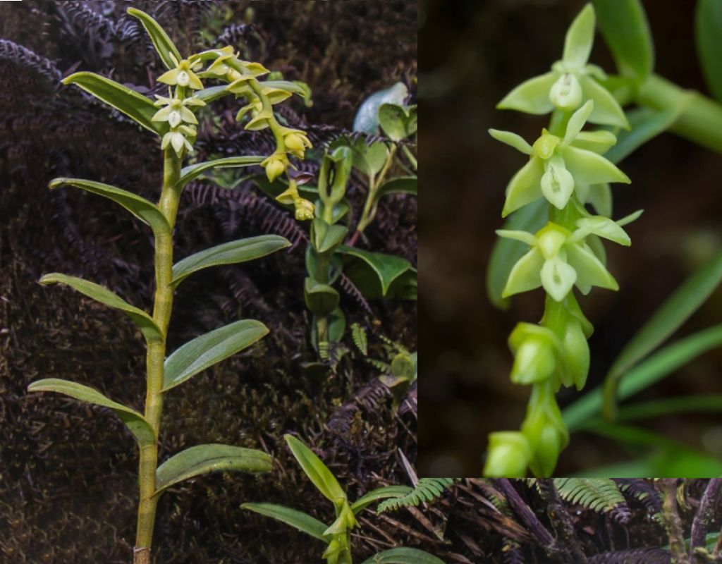 Found in Guadelupe, Martinique and St Kitts & Nevis and Anguilla within the windward lesser Antilles at elevations of 1080 to 2150 meters in elevations as a medium sized, cool to just cold growing terrestrial or lithophytic orchid with branching, cane-like, terete, erect, main stem 4 to 5 times longer than the branches, all covered by non-foliar, tubular, scarious and becoming fibrous with age sheaths, slightly sinuous stems and carrying numerous on the main stem, distributed throughout, up to 6 on the branches, alternate, articulate, spreading, coriaceous, tubular, striated, rugose sheaths oblong-lanceolate, rounded, margin entire leaves that blooms in the spring through summer on a terminal, without a spatheshort, flowering only once, peduncle very short, rachis sinuous, 1.6 to 4" [4 to 10 cm] long, racemose to paniculate, arching, laxly 8 to 17 flowered inflorescence with prominent, somewhat recurved, as long as the flower or slightly shorter, widely ovate-triangular, cymbiform, apex acute, spaced one from the other, distichous floral bracts and carrying non-resupinate, distichous, fleshy, green or yellow-green flowers without fragrance data.
