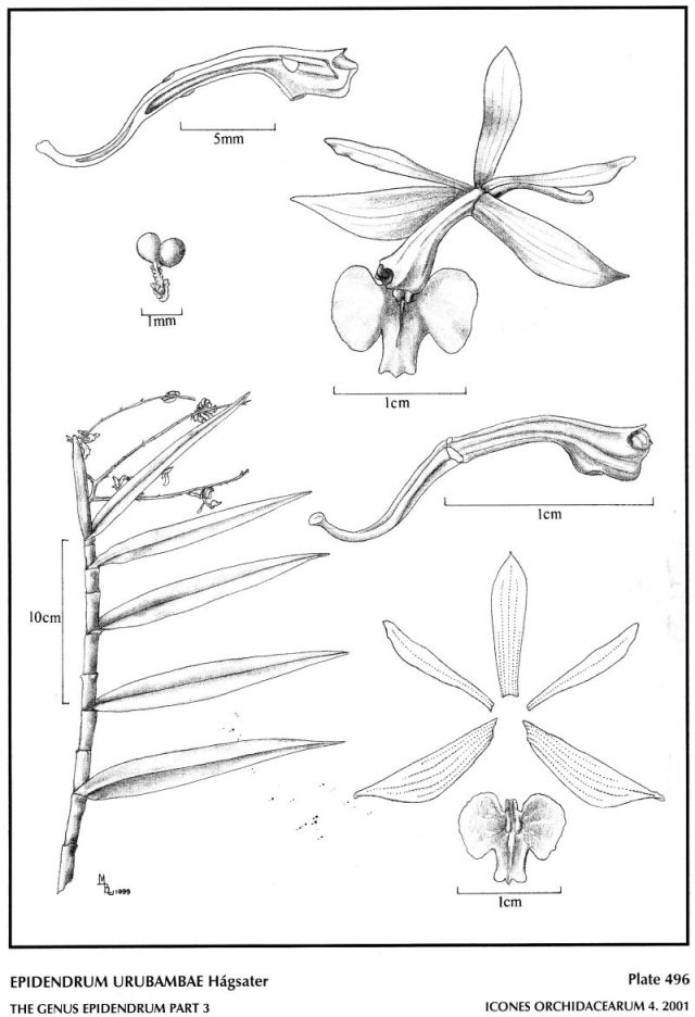 "Epidendrum urubambae belongs to the GROUP Excisum SUBGROUP Excisum recognized by the simple stems, prominent spathe. The species is closely related to E. utcuyacuense, but E urubambense differs in the acute spathes, and is distinguished by the paniculate inflorescence and somewhat larger flowers. the sepals being .48 to .6" [12 to 15 mm] long, thin, short ovary. E. utcuyacuense Epidendrum baezense Hágsater & Dodson is similar overall but the lip is not deeply 3-lobed, and the tepals are proportionately wider and obtuse. Epidendrum excisum Lindl. is strap-leaved, the leaves being oblong and coriaceous, the apex bilobed and the spathes rounded." Hagsater etal 2001