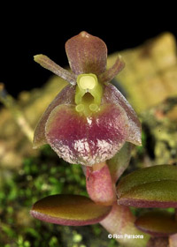 Found in Peru in the eastern Andes at elevations around 1000 to 1100 meters as a mini-miniature sized, cool growing epiphyte with simple, cane-like, terete, straight stem arising from the middle of the previous stem and carrying 3 to 5, alternate, distributed throughout the upper half of the stem, articulate, elliptic-lanceolate, acute, succulent, smooth, dark green, unequal leaves that blooms in the summer on a terminal, sessile, short, arising from a mature growth, occuring only once, single flowered inflorescence with the ovary enveloped partially by a semi-oblong, conduplicate spathe and carrying single, resupinate flower