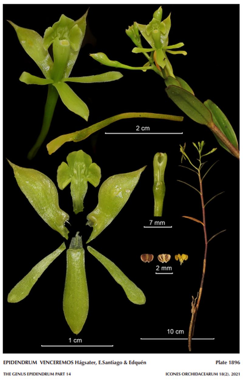 "Epidendrum venceremos belongs to the GROUP Andean SUBGROUP Vernixium which is characterized by the monopodial habit with sub-apical branching, erect inflorescences, laxly non-resupinate, spreading flowers, and the lip entire to 3-lobed and facing downwards. The new species is recognized by the leaves .68 to 1.52 x .2 to .32" [1.7 to 3.8 x 0.5 to 0.8 cm], oblong, green with the margin purple-black, the inflorescence with 8 successive flowers yellow-green, erect, non-resupinate, lateral sepals 13.8 mm long, mucronate, the mucronate lip .248" x .3" [6.2 x 7.5 mm], 3-lobed, the lateral lobes flabelliform, and the mid-lobe rectangular, the disc with a wide, fleshy mid-rib and short, fleshy thickened veins, and the ovary slightly inflated behind the perianth. Epidendrum elatum C.Schweinf. is widespread from Colombia to Bolivia, and much larger overall, the leaves 1.2 to 6.4 x .72 to 1.6" [3 to 16 x 1.8 to 4.0 cm], those of the main stem much larger than those of the branches, flowers 20 to 35, green to yellow-green, lateral sepals .6 to .84" x .194 to .26" [15 to 21 x 4.6 to 6.5 mm], lip .28 to .4" x .45 to .44" [7 to 10 x 10 to 11 mm], disc with 3 low narrow ribs that reach the apex of the lip. Epidendrum pozoi, endemic to Ecuador, has leaves 2.2 TO 3.8" X .36 TO .48" [5.5 to 9.5 x 0.9 to 1.2 cm], linear-elliptic, the apex bilobed, the inflorescence up to 17 green flowers, the lateral sepals .76 to 1.04" [19 to 26 mm] long, the lip .44 to .52" x .52 to .56" [11 to 14 x 13 to 14 mm], with the lateral lobes sub-ovate-quadrate, and the midlobe slightly emarginate. Epidendrum centronum Hágsater & Dodson has very similar leaves, 2.4 to 3.6" x .32 to .52" [6 to 9 x 0.8 to 1.3 cm], flowers green tinged brown, the sepals .8 to .84" [20 to 21 mm] long, and the lip .36 x .28" [9 x 7 mm], panduriform with 3 thin parallel ribs. Epidendrum deorsus Hágsater & E.Santiago is endemic to central Peru and its leaves are1.04 to 5.2" x .8 to 1.2" [2.6 to 13 x 2.0 to 3.0 cm], oblong-elliptic, the flowers green turning ochre-yellow, horizontal, with the lip looking down, the sepals .;84" [21 mm] long, and the lip .4 x .4" [10 x 10 mm], cordiform with the calli sub-globose" Hagsater etal 2021