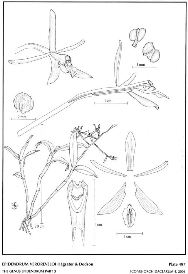 "Epidendrum veroreveloi is part of the GROUP Herrenhusanum characterized by the caespitose, sympodial habit, the erect racemose inflorescence subtended by a narrow, long spathe, and non-resupinate flowers. The species has a caespitose habit, with simple, laterally compressed stems, an acute spathe, erect racemose inflorescence, short floral bracts, non-resupinate, simultaneous flowers with .6 to .64" [15 to 16 mm] long sepals, single veined petals, and an ovate lip. It was confused with Epidendrum trulliforme which has slightly separated stems, 4 leaves, 1 to 2 narrow, acute spathes, racemose to 1 branched inflorescence, the floral bracts as long as to shorter than the ovaries, resupinate flowers with a trulliform to somewhat hastate lip, 3-veined petals, sepals .64 to .8" [16 to 20 mm] long, the flowers produced in succession, several being open at one time. Epidendrum trilobochilum Hágsater & Dodson has a clearly 3-lobed lip, the lateral lo bes slightly smaller than the obcuneate midlobe which is slightly emarginate and mucronate; the flowers are produced simultaneously. Epidendrum fruticetorum Schltr. has a 3-lobed lip, the midlobe clearly bilobed." Hagsater etal 2001