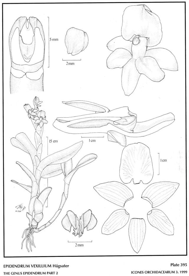 "Epidendrum vexillium is recognized by its broadly ancipitous stems, with 2 to 4 large, wide, elliptic leaves, the nearly flat, subrectangular to suborbicular lip, somewhat wider near the base than near the apex, upright, extending on the same axis as the column, and the well-spread sepals, which are neither revolute nor reflexed. It belongs to the GROUP Spathiger SUBGROUP Circinatum and is similar to E. circinatum which has an obcuneate lip broader towards the apex than at the base and is inflexed at a 90 degree angle with the axis of the column, so that in natural position the lip is horizontal but looking downwards, covering the entry of the nectary, the sepals and petals are strongly revolute." Hagsater etal 1999