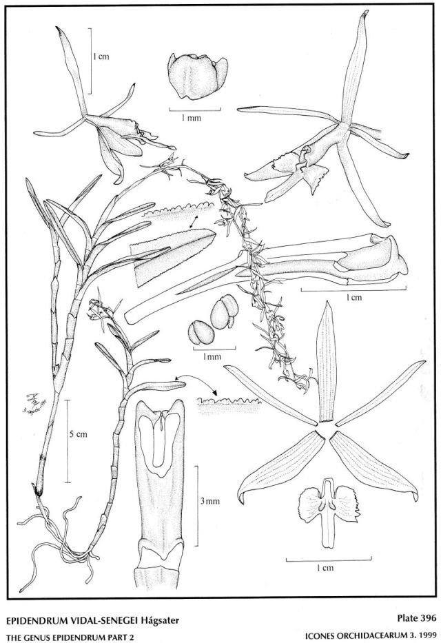 "Epidendrum vidal-senegei is part of the GROUP Alpicolum SUBGROUP Pergracile and distinguished by the stout stem with wider, crenulate leaves, the bicallose lip and the midlobe narrowly rectangular. It is similar to Epidendrum pergracile which has lanceolate, acute leaves with an entire margin, and the lip tricallose and the midlobe triangular." Hagsater etal 1999