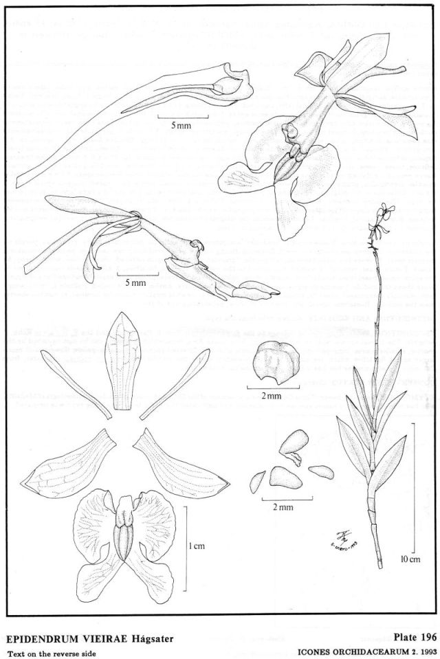 "Epidendrum vieirae belongs to the GROUP Pseudepidendrum SUBGROUP Turialvae. The closest known relative is E. turialvae, from Costa Rica, from which E. vieirae can be distinguished by the shorter, smaller leaves, long-pedunculate inflorescence with few-flowered racemes, greenish-yellów flowers, and much larger apical lip lobes which are conspicuously broadened above the middle. Epidendrum rodrigoi Hágsater, from Colombia, is also similar but has a light pink, somewhat hyaline lip." Hagsater etal 1993