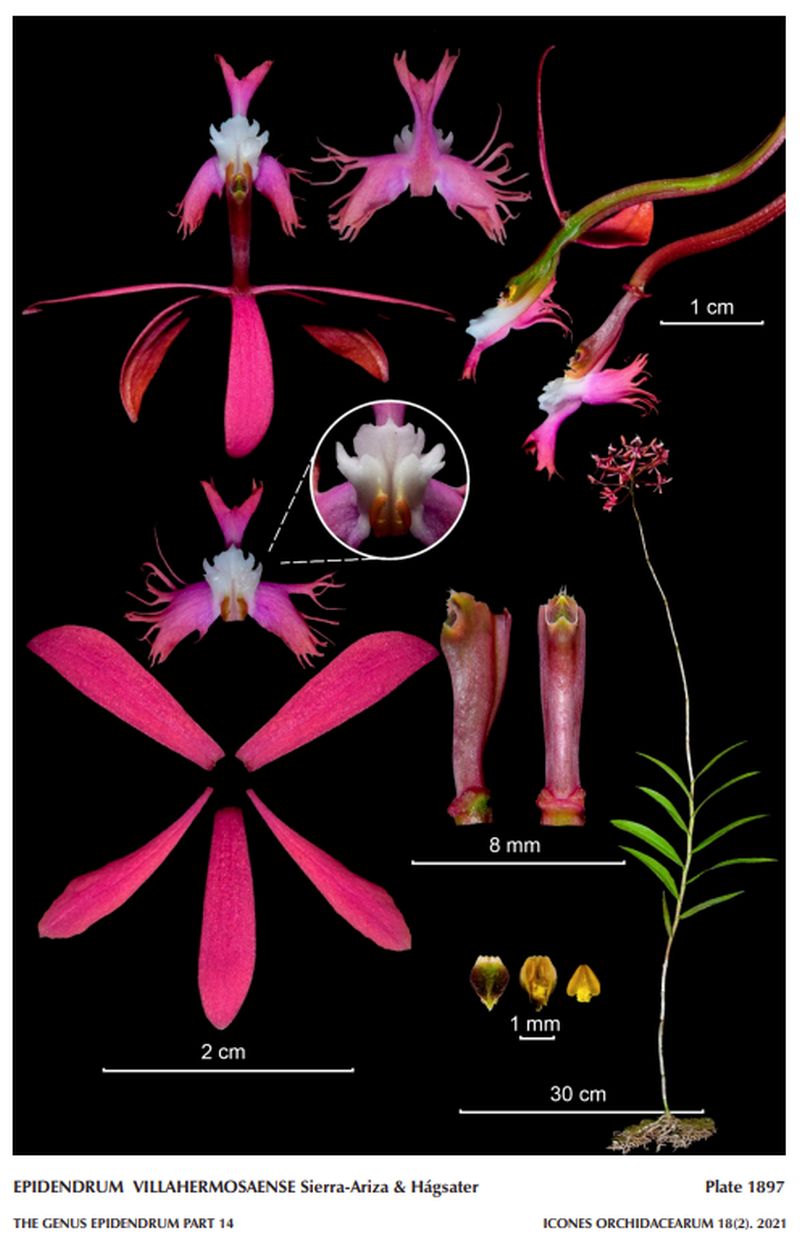 "Epidendrum villahermosaense belongs to the GROUP Secundum SUBGROUP Secundum, which is characterized by the caespitose habit, the erect, simple, cane-like stems, the normally elongate peduncle of the inflorescence, the erect raceme of generally non-resupinate, showy, colorful flowers, and a lip adorned by a complex a callus. The species is recognized by the pink-crimson flowers with a large wide, truncate callus, the sepals .68 to .76" [17 to 19 mm] long, the lateral sepals oblong, apex obliquely acute, the retrorse lateral lobes of the lip deeply lacerate, spreading with the lateral margins entire and strongly revolute, the mid-lobe “Y” shaped, narrow at the base, and spreading towards the apex, with the lateral margins strongly revolute. Epidendrum imperator from Antioquia has somewhat smaller, bright red flowers, sepals .56 to .73" [14 to 18 mm] long, the margins of the lateral lobes of the lip are deeply dentate, and the mid-lobe is entire, sub-quadrate and obtuse. A photograph of Epidendrum imperator was published in 1991 as Epidendrum catillus (Hágsater 1991). Epidendrum acutilobum Hágsater & Uribe-Vélez, from the Cordillera Oriental of Colombia, has pale pink-red flowers, with a large white callus on the lip, sepals .576" [14.4 mm] long, oblanceolate, petals .68" [15.2 mm] long, elliptic-oblanceolate; the massive callus prominent, formed by a massive truncate plate ending in 3 acute tubercules, with a pair of thick elliptic tubercules on top of the plate at the sides of the base that divergently terminate in acute points, the small lateral lobes of the lip, obliquely semi-flabellate, and the mid lobe of the lip triangular acute, margins entire. Epidendrum flabellilobatum Hágsater & Medina-Tr. is somewhat similar in color and floral shape but the flowers are smaller, sepals .44 to .5" [11.0 to 12.5 mm] long, the lip is quite distinct, lateral lobes sub-quadrate to semi-flabelliform, lateral margins entire, revolute, and the mid-lobe flabelliform, apex more or less shallowly emarginate; it ranges along the Cordillera Oriental of the Andes in Colombia." Hagsater etal 2021