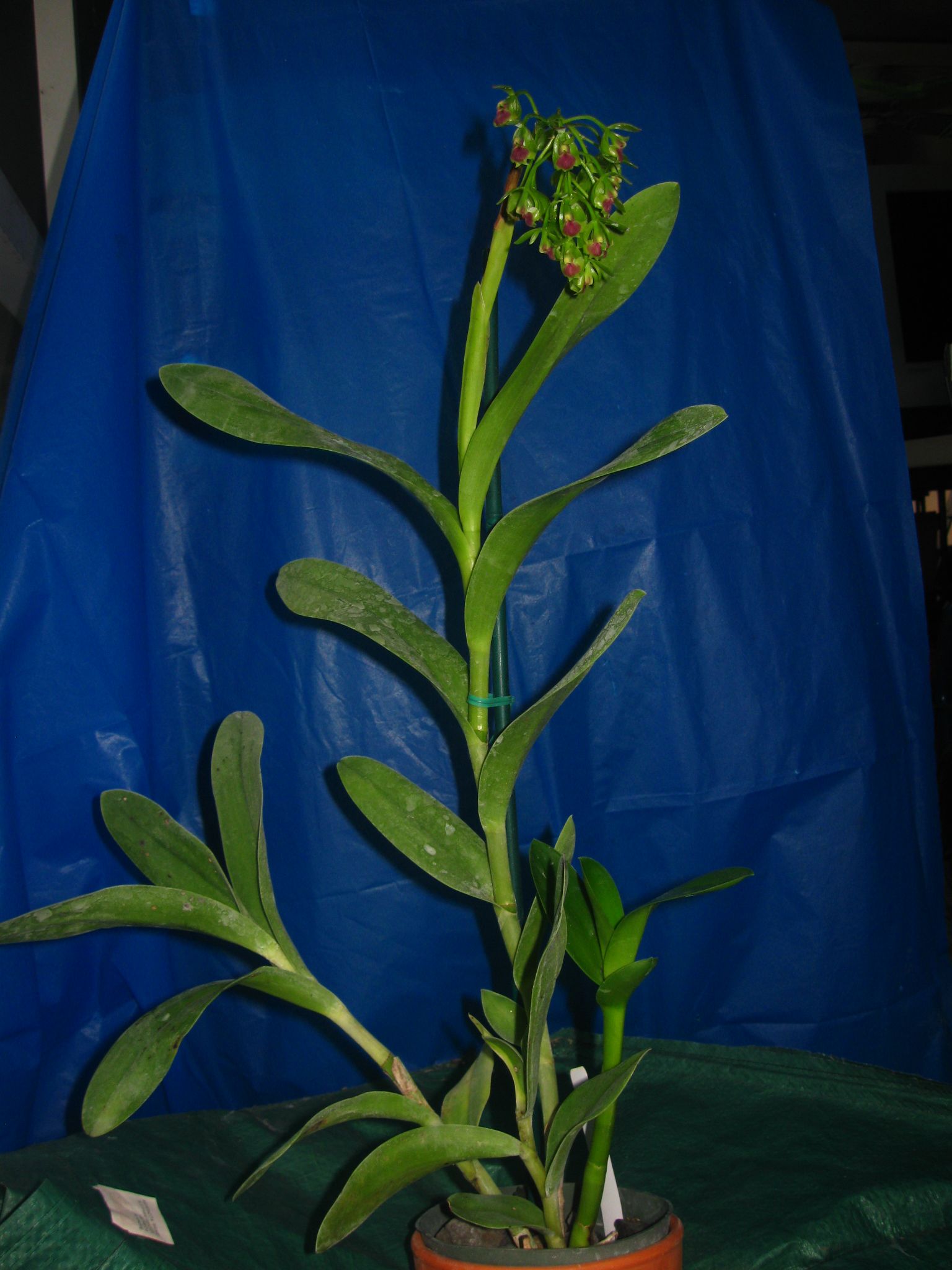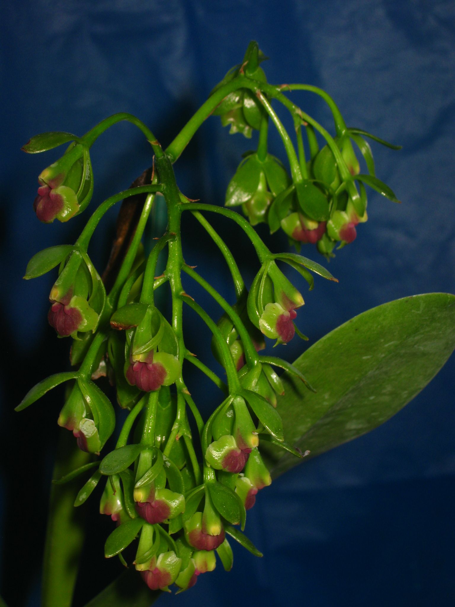 This orchid has often been cited as a synonym of E anceps from the GROUP Anceps SUBGROUP Anceps but this one differs in the coriaceous, unequal, rounded leaves, the half open green flowers with bronze purple and the brick red disc of the labellum and is a close relative of E nutans in the GROUP Pseudepidendrum SUBGROUP Viridipurpureum .