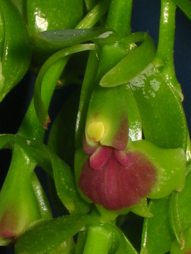 Found in Jamaica in moist and wet broadleaf forests at elevations of 600 to 950 meters as a medium sized, warm growing epiphyte with simple, cane-like, terete, erect stems carrying 6 to 8, all along the stem, smooth, coriaceous, entire, elliptic-lanceolate, obtuse to bilobed, unequal leaves that blooms in the winter through late spring on a terminal, without a spathe, erect, arising on mature stem, occuring only once, peduncle slightly flattened, with 2 unequal, spathe like, conduplicate, obtuse to acute, tubular bracts, the raceme, arcuate, to 7.2" [18 cm] long, 6 to 17 flowered inflorescence and shorter than the ovary, triangular, acuminate floral bracts and carrying odorless, resupinate flowers.