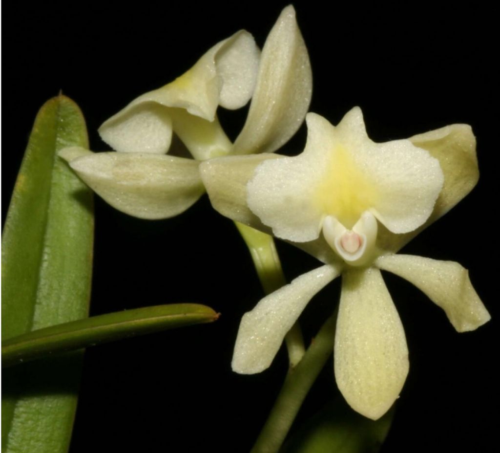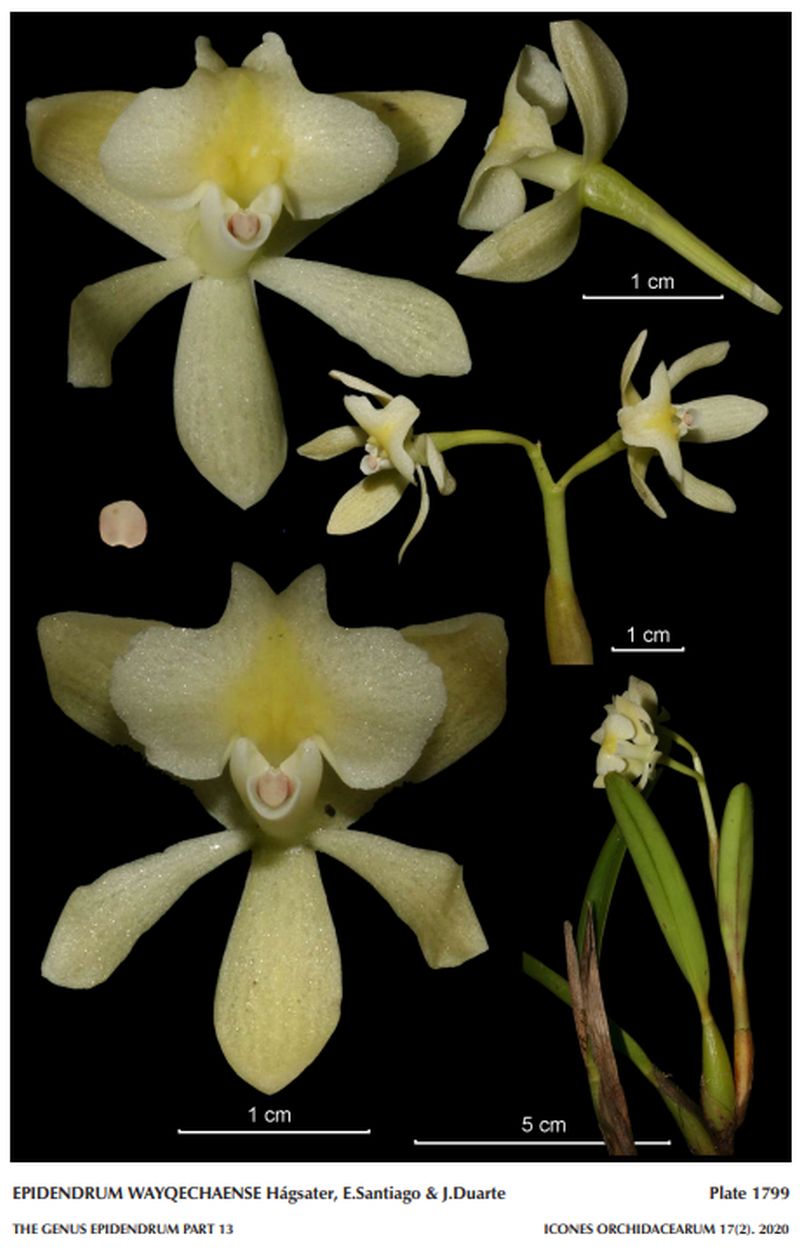 "Epidendrum wayqechaense belongs to the GROUP Saxicola characterized by the pseudobulbous stems, caespitose or scandent habit, the prominent spathaceous bract apically rounded, few-flowered, erect inflorescence, the flowers purple or yellow, and the surface of the vegetative structures often rugose. The new species is recognized by the 2-flowered inflorescence with creamy-white flowers and a yellow spot on the disc of the lip; sepals .52" [13 mm] long, petals .52 x .1" [13 x 2.5 mm], narrowly spatulate-oblanceolate, lip 3-lobed, with the mid-lobe sub-quadrate when spread, in natural position appearing emarginate, as if formed by two triangular lobes. It is similar to Epidendrum microcattleyioides which has 4 yellow flowers, sepals .46 to .48" [11.5 to 12.0 mm] long, petals .44 x .26" [11 x 6.5 mm], obovate-spatulate, a lip entire, reniform with the apex widely emarginate. Epidendrum herreranum C.Schweinf. has yellow flowers, tinged orange to reddish bronze, sepals .72 to .94" x .28 to .4" [18.0 to 23.5 x 7.0 to 10.0 mm], ovate-elliptic, petals .68 to .92" x .2 to .4" [17 to 23 x 5.0 to 10.0 mm], obovate-spatulate, and the mid-lobe of the lip an inverted “T”, apex forming two divaricate lobes which overlap with the corners of the lateral lobes. Epidendrum tetartociclium Collantes & Hágsater has pale green to creamy green sepals, translucid to somewhat opaque, petals and lip creamy green to citrus yellow, sepals 1 to 1.04" [25 to 26 mm] long, elliptic, and petals .96 x .32" [24 x 0.8 mm], oblong-elliptic to oblong-obtrullate. Epidendrum repaskyae Hágsater, E.Santiago & J.Duarte has 3 to 4 creamy white flowers, the sepals and petals forming a cup, sepals .44" [11 mm] long, petals .4 x .2" [10 x 5 mm], elliptic, and the lip slightly 3-lobed." Hagsater etal 2020