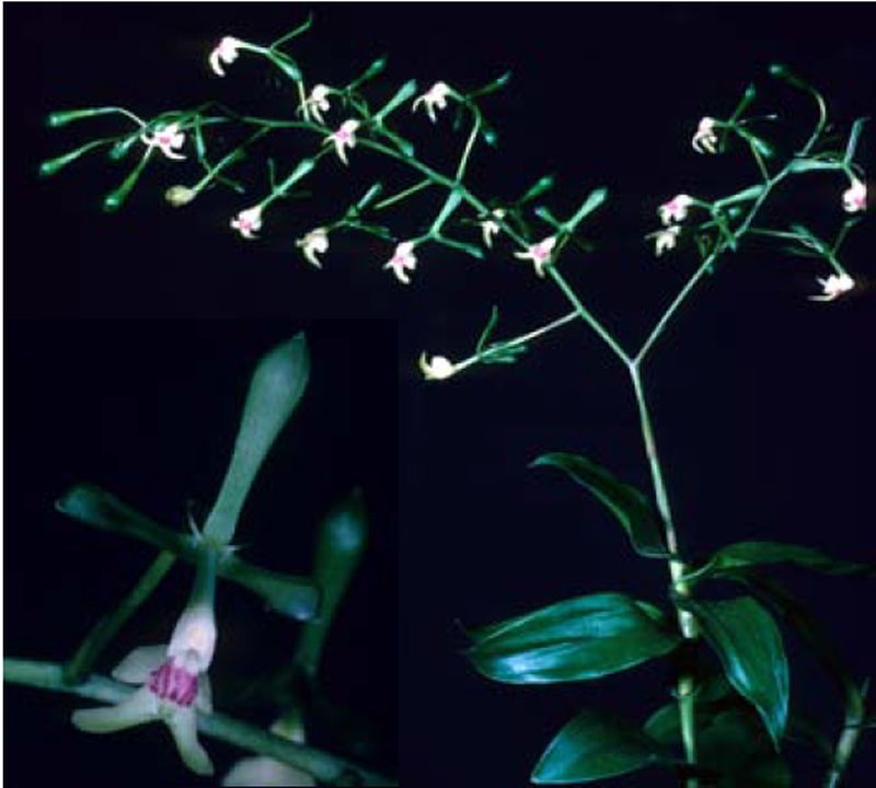 Found in southern Colombia on the Cordillera Occidental and in Antioquia and Quindio departments of Colombia at elevations of 1770 to 2050 meters as a large sized, cool to cold growing lithophyte with simple, cane-like, terete stems carrying 12, subcoriaceous, all along the apical half of the stem, alternate, articulate, erect spreading, elliptic, acute, margin entire leaves that blooms in the late summer through early winter on a terminal, without a spathe, paniculate, occuring only once, peduncle 2" [5 cm] long, straight, thin, with a single, lanceolate, acuminate, amplexicaul bract, rachis 3.6" [9 cm] long, lax, simultaneously 10 to 20 flowered inflorescence with much shorter than the ovary, narrowly triangular, acuminate, amplexicaul floral bracts and carrying resupinate flowers with the tepals and the basal half of the column is green, the apical half of the column and the lip are white with 5 reddish purple lines on the ribs and the lobes of the lip are densely spotted with reddish-purple. The fragrance data was not recorded.