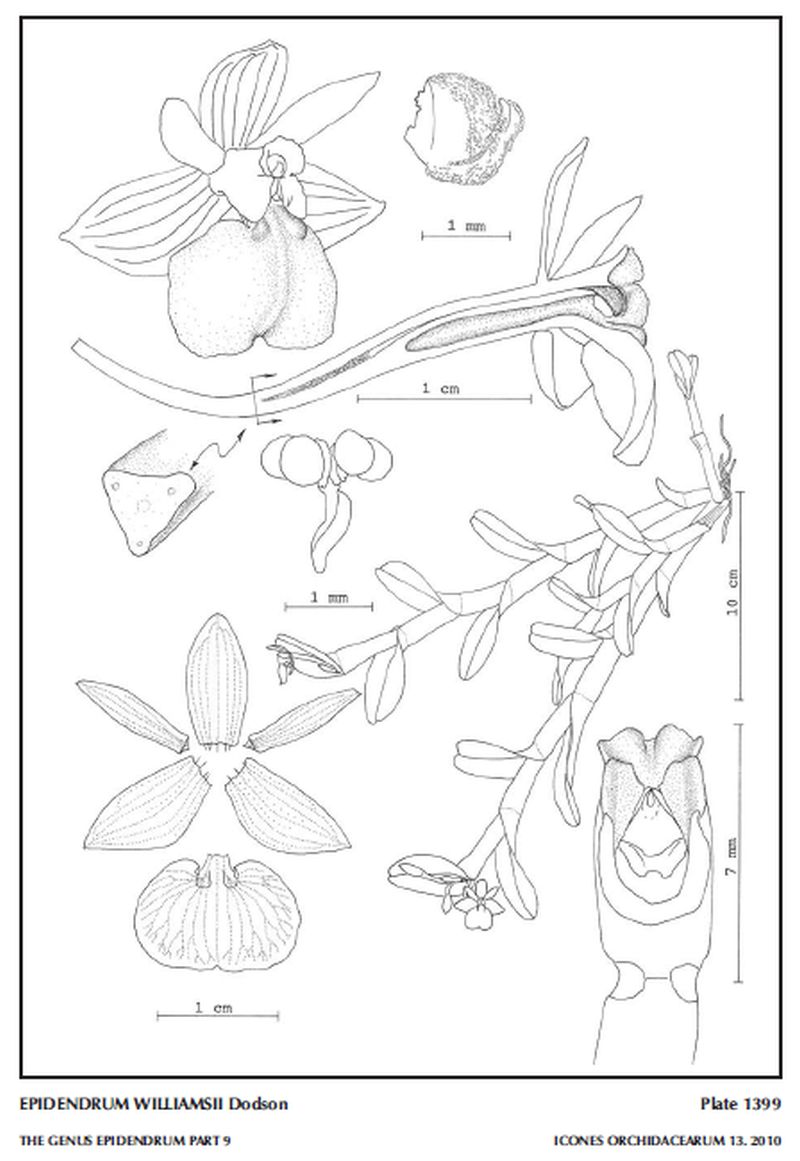 "Epidendrum williamsii belongs to the GROUP Difforme which is characterized by the caespitose, sympodial plants, fleshy, pale green to glaucous leaves, apical inflorescence, sessile, rarely with a short peduncle, one-flowered to corymbose, without spathaceous bracts, fleshy, green to yellowish-green rarely white flowers. The species can be recognized be recognized by its laterally compressed stems, 1 to 3 small, successive flowers, ovary trigonous, lip reniform, emarginate. It is very similar vegetatively to Epidendrum werffii Dodson & Hágsater which is found in the same area, but that species has 1 to 2, larger flowers, sepals 3.6 [90 mm] long and petals lanceolate, acuminate." Hagsater etal 2010