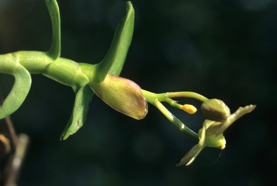 Found in western Ecuador in wet montane cloud forests at elevations of 450 to 700 meters as a miniature sized, hot to warm growing epiphyte with cane-like, laterally compressed stems enveloped completely by imbricating leaf-bearing sheaths and carrying several, linear-lanceolate, obtuse, basally clasping leaves with inflated leaf sheaths that blooms at most any time of the year on a terminal, sessile, successively 1 to 5 flowered inflorescence with up to 2 to 3 flowers open at any one time.