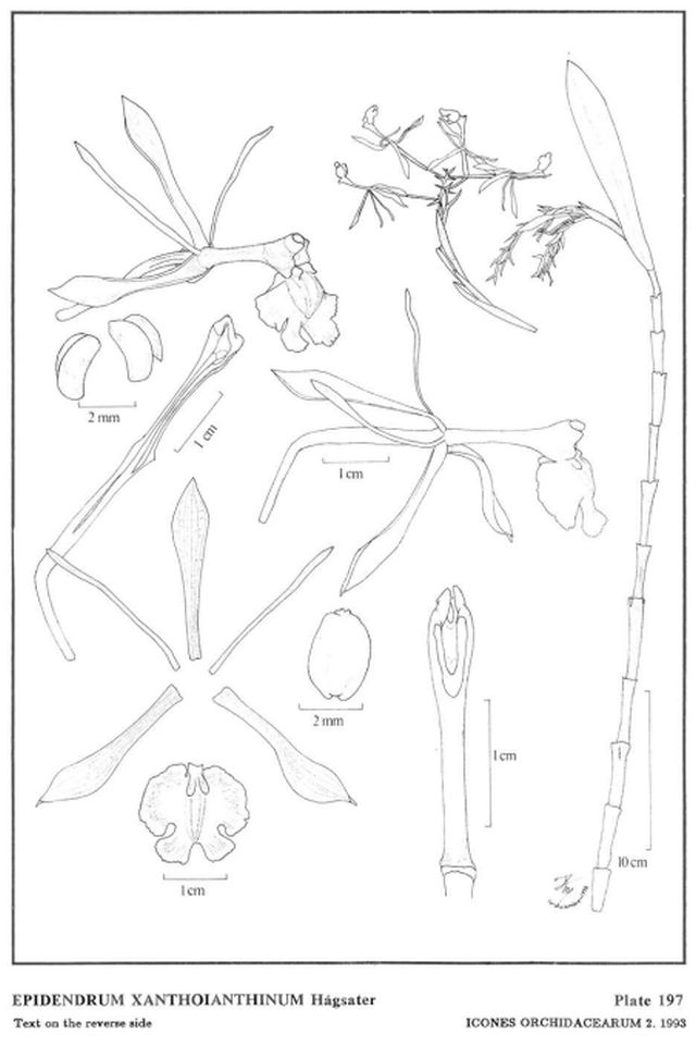 References W3 Tropicos, Kew Monocot list , IPNI ; Native Colombian Orchids Vol 2 pg 172/ #185 as Epi sp. photo fide; Native Colombian Orchids Vol 6 COS 1998 Errata; * Icones Orchidacearum 2 Plate 197 Hagsater & Salazar 1993 drawing fide; Native Colombian Orchids Vol 6 COS 1998 errata = E xanthoianthinum; Icones Orchidacearum Vol 11 Plate 1165 Hagsater & Sanchez 2008 see recognition section; Icones Orchidacearum 14 Plate 1434 Hagsater & Santiago 2013 See recognition section; Orchids of the Department of Valle De Cauca Colombia Vol 2 Kolanowska, Hagsater etal. 2014 drawing fide; AOS Bulletin Vol 85 #1 2016 photo fide; Orquideas, Tesoro de Colombia Vol 2 Ortiz & Uribe 2017 drawing/photo good;