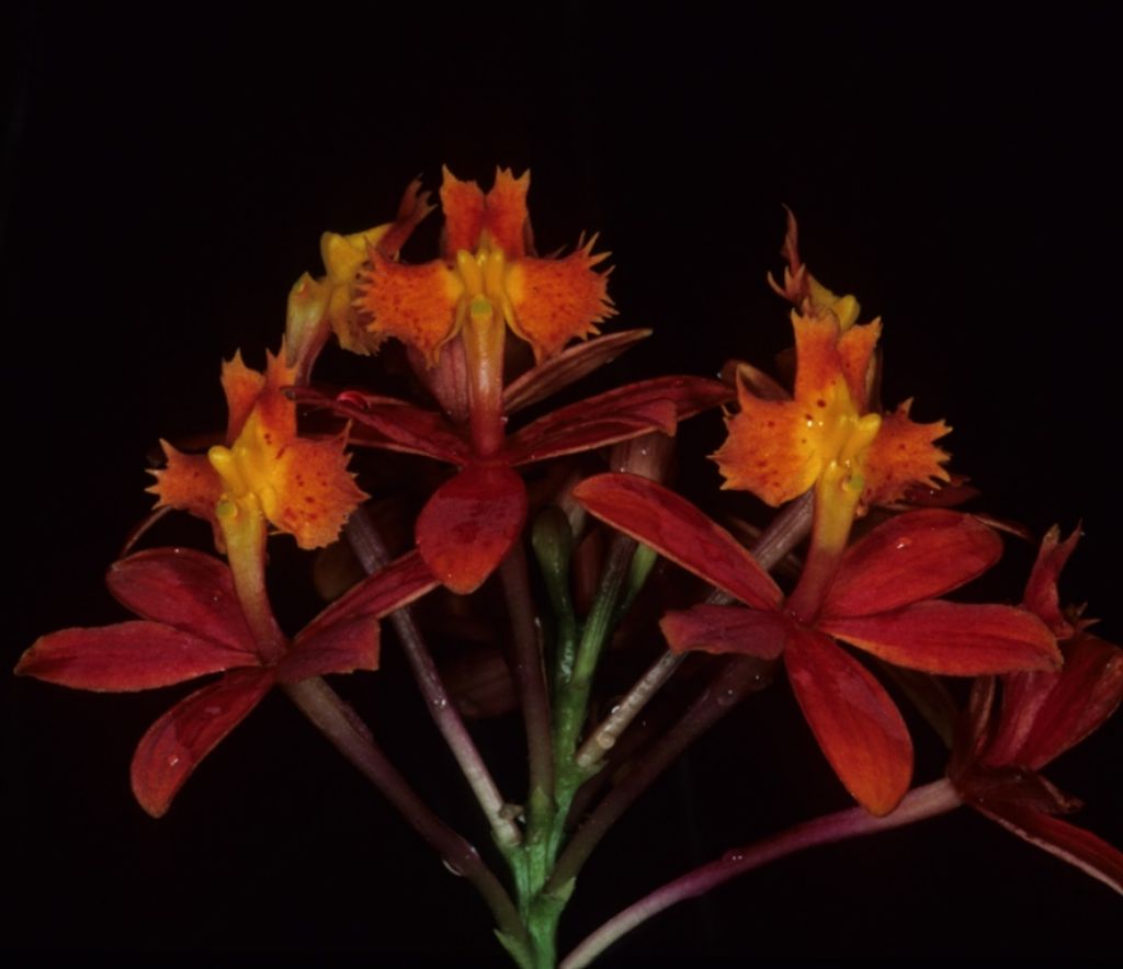 Epidendrum fulgens is found in the sand dunes close to the beach, and E. puniceoluteum in the swamp further inland, with the hybrids adapted to both habitats (Pinheiro 2010: 3983)
