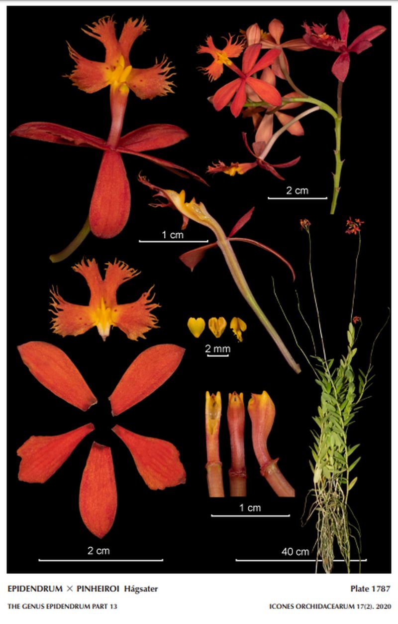 "Epidendrum pinheiroi belongs to the GROUP Secundum SUBGROUP Secundum which is characterized by the caespitose habit, erect, simple, cane-like stems, the normally elongate peduncle of the inflorescence, the erect raceme of showy, colorful flowers generally resupinate, and a lip adorned by two calli and a median narrow keel. The hybrid is recognized by the red non-resupinate flowers, the lip orangered, the anther green, the apical lobes of the column, calli and mid-rib of the lip yellow, the yellow spilling onto the disc of the lip with small red dots, the calli are digitiform and upright, not laminar, petals rhombic-spatulate, .296 [7.2 mm] wide, and the lip deeply 3-lobed, base somewhat cordate, lateral lobes sub-quadrate, mid-lobe a narrow isthmus in the basal half, apical half bilobed, these lobes divergent, sub-quadrate, the distal margin laciniate. Epidendrum puniceoluteum, from the southern coast of Brazil, restricted to swamps along the coast, is also very similar; the petals are elliptic, .16 to .308" [4.0 to 7.7 mm], the wider and shorter column has shorter apical lobes, and lip with sub-quadrate calli and has a wider mid-rib. Epidendrum fulgens is more widespread along the coast throughout São Paulo, Paraná, Santa Catarina, and the northern half of Rio Grande do Sul, and has red flowers, the lip yellow dotted red, flowers non-resupinate, facing towards the center of the raceme, endemic to the restinga sand dunes along the coast from São Paulo to Santa Catarina." Hagsater etal 2020