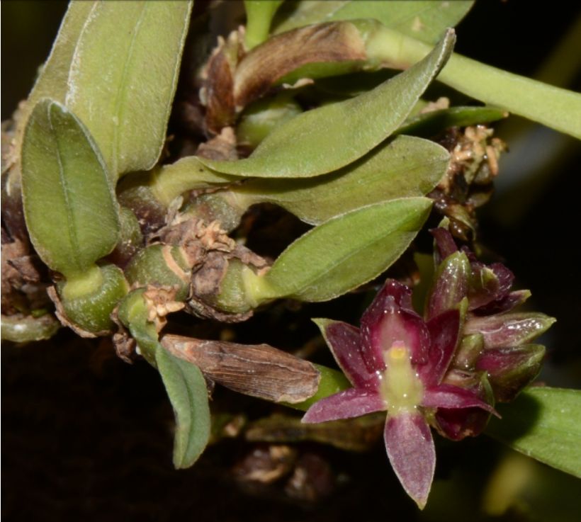 Found in Loja province of Ecuador and Peru near the summit of the Cordillera Occidental on the western, dry side in sub-paramo montane on small trees of Myrcianthes sp. and Clusia sp. at elevations of 2900 to 3400 meters as a mini-miniature sized, cold growing epiphyte with thickened into an ovoid pseudobulb, short, dark green, covered by non-foliar, somewhat striated when dry sheaths . and carrying a single lanceolate, acute, fleshy, coriaceous, smooth, dark green, margin entire, spreading leaf that blooms in the Flowering from late fall, winter, and earlier spring on a terminal, sessile, peduncle terete, thin, short, somewhat covered by 4 basal, widely ovate, acuminate, embracing bracts, sub-umbellate, racemose, much shorter than the leaf successively few, eventually all open at once, to 6 flowered inflorescence with gradually shorter than the ovary, triangular-lanceolate, acuminate floral bracts carrying non-resupinate, wine red flowers with the margins and apex of sepals sometimes pale green, column green to wine-red, base of lip pale; without fragrance.