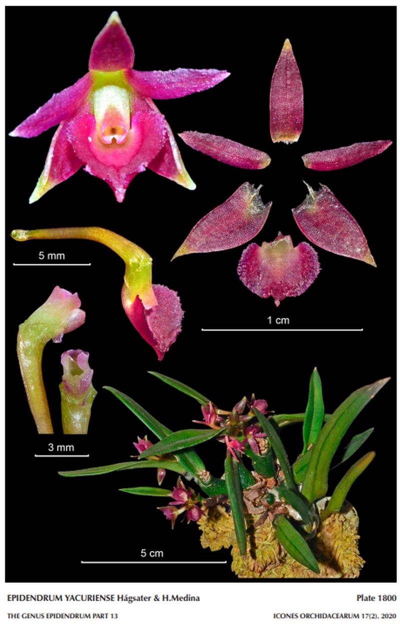 "Epidendrum yacuriense belongs to the GROUP Kalopternix SUBGROUP Serpens, characterized by the aggregate, globose pseudobulbs with fleshy-coriaceous leaves, a sessile inflorescence, one or few fleshy, compact, star-shaped flowers, often burgundy red in color, and the lip entire, more or less cordiform. The species is recognized by the single leaved pseudobulb, sub-umbellate sub-sessile inflorescence of up to 6 wine-red flowers, non-resupinate, sepals .252" to .268" [6.3 to 6.7 mm] long , petals oblong-lanceolate, acute, and the lip widely cordiform, base cordate, apex short apiculate, somewhat concave in natural position, margin dentate, especially towards the sides, ecallose. Epidendrum pachycoleum Hágsater, O.Pérez & E.Santiago has an erect plant, 1 to 2 leaved, aggregate, homoblastic pseudobulbs, elliptic leaves, the apical one often much reduced, sessile flowers produced in succession, sometimes 2 open at one time, and sepals .28 to .292" [7.0 to 7.3 mm] long. Epidendrum serpens Lindl. also has an erect plant, but 2 to 3 leaves per pseudobulb, leaves ovate-lanceolate, linear-lanceolate petals, and the lip subrounded-ovate. Epidendrum platyphylloserpens Hágsater, from Ecuador, has pendent leaf, oblong-elliptic, acute, up to 9 flowers opening in succession, several open at one time, and the sepals are 5-veined, .34" [8.5 mm] long. Epidendrum breviyacuriense Hágsater, H.Medina & J.Duarte has wine-red globose pseudobulbs, ovate leaves .52 to .76" .24 to .28" [1.3 to 1.9 x 0.6 to 0.7 cm], wine-red towards the margins, resupinate, reddish violet flowers, and the lip with a narrow mid-rib running down to the middle of the disc." Hagsater etal 2020