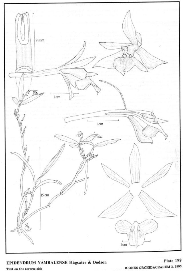 "Epidendrum yambalense is part of the GROUP Arbusculum SUBGROUP Incomptum characterized by the successive lateral growths produced from the middle of the previous growth, few leaves aggregate towards the apex of the stems, a short apical inflorescence with fleshy greenish to violet-green flowers with short ovaries, the lip entire to 3-lobed. This plant has erect stems where the new growth arises from a middle internode of the previous stem, short , 4 to 7 flowered racemes and membranaceous, green flowers with 3-lobed, purplish lip with raised veins, suborbicular lateral lobes and subquadrate, apiculate midlobe. Epidendrum morganii Dodson & Garay is closely related but has an entire, cordiform lip." Hagsater etal 1993