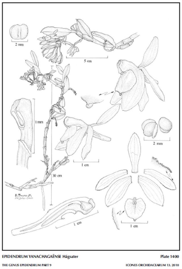 "Epidendrum yanachagaënse belongs to the GROUP Andean SUBGROUP Soratae which is characterized by the branching habit starting on a monopodial, primary stem, infundibuliform, rugose leaf-sheaths, lanceolate, aristate, acute leaves, racemose sub-capitate inflorescence on a short, thin peduncle, and the bicallose lip. The species is recognized by the small plants with very short branches, leaves elliptic-ovate, .32 to 1.6" x .36 to .52" [0.8 to 4.0 x 0.9 to 1.3 cm], green flowers, sepals .6 to .64" [15 to 16 mm] long, wide and falcate, the petals are oblanceolate, falcate, wide and 3-veined, and a suborbicular lip slightly cordate at the base, the margin crenate. Epidendrum soratae Rchb.f. has taller plants, 8.8 to 10.8" [22 to 27 cm] tall, lanceolate leaves .68 to 1.88" [1.7 to 4.7 cm] long, 8 to 12 yellowish green flowers, sepals .268 to .28" [6.7 to 7 mm] long, and a reniform lip, the base deeply cordate, the margin entire. Epidendrum obliquum Schltr. has plants up to 22.8" [57 cm] tall, lanceolate leaves .8 to 1.6" [2 to 4 cm] long, and a reniform lip with entire margin, the column straight and the ovary is not inflated." Hagsater etal 2010