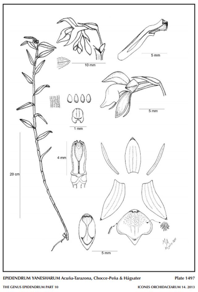 ": Epidendrum yanesharum belongs to the GROUP Elleanthoides SUBGROUP Rhombochilum which is characterized by the branching habit, small fleshy leaves and a short 3 to 4 flowered, nutant inflorescence on a short thick peduncle. The species is recognized by the lanceolate leaves 1.52" to 1.88" x .28 to .4" [3.8 to 4.7 x 0.7 to 1 cm]; the sub-sessile inflorescence that produces successive racemes when the previous raceme is still in flower; lateral sepals oblong-elliptic, acute, .28 to .32" [7 to 8 mm] long, the lip clearly 3-lobed, its base cuneate, and the 4 pollinia. Epidendrum chinchaoense Hágsater, D.Trujillo & E.Santiago is vegetatively very similar but the lateral sepals are lanceolate, strongly falcate and acuminate; the lip is entire with the apex long-acuminate, and the column geniculate at the base with respect to the ovary. Epidendrum oripicoranense Hágsater & E.Santiago has shorter, lanceolate-oblong leaves, .24 to .92" x .08 to .12" [0.6 to 2.3 x 0.2 to 0.3 cm]; the inflorescence is distichous, non-successive, sepals elliptic, .2 to .24" [5 to 6 mm] long, and the flowers are greenish purple with a cream-colored lip." Hagsater etal 2013