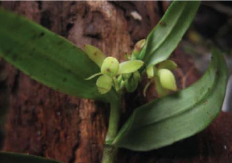 Found in Pasco department of Peru at elevations around 3170 meters as a medium sized, cold growing epiphyte with terete, canelike, erect, straight, branching from the sub-apical internodes of the stems that are enveloped basally by tubular, non-foliaceous, scarious sheaths and carrying up to 15, all along the apical half of the stem, alternate, articulate, coriaceous, lanceolate, low dorsal keel, unequally bilobed, margin crenate leaves that blooms in the spring on a terminal, pluri-racemose, a new raceme arising while the original is still in bloom, subtended by a basal, triangular-ovate, acute, amplexicaul, short bract, arching, sub-sessile, .56" [1.4 cm] long, successively 4 flowered, 2 open at any one time inflorescence with nearly as long as the ovary, prominent triangular, acuminate, amplexicaul floral bracts and carrying non-fragrant flowers.