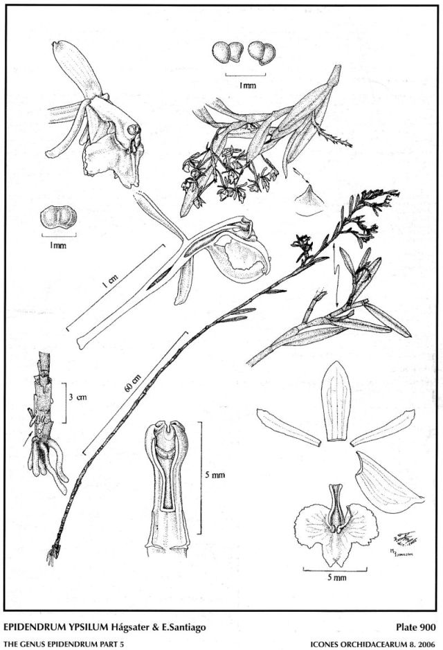 "Epidendrum ypsilum belongs to the GROUP Andean SUBGROUP Soratae which is characterized by the branching habit starting on a primary stem, infundibulitorm, rugose leaf-sheaths, lanceolate, aristate, acute leaves, racemose inflorescence on a short, thin peduncle, and the bicallose lip, The new species resembles Epidendrum physopus Kraenzl. but the plants of that species are very small, short, linear-lanceolate leaves, .48 to 1.12" [1.2 to 2.8 cm] long, brownish green, resupinate flowers, the sepals dorsally with red-violet dots, petals filiform and the 3-lobed lip rounded at the apex. Epidendrum chrysomyristicum Hágsater & E.Santiago has vegetatively similar plants, yellow, resupinate flowers occasionally tinged reddish, sepals .4 to .5" [10 to 12.5 mm] long petals linear-Ianceolate, acute and the 3-lobed lip and the midfobe "T" shaped. Epidendrum fruticulum has elliptic, rounded leaves, yellow, resupinate flowers, sepals .24 to .36" [6 to 9 mm] long, linear-oblanceolate, rounded petals, and the lip 3- lobed, wlth the midlobe rectangular, slightly widened towards the apex, entire. Epidendrum stenostachyum Hágsater & E. Santiago has a racemose, narrow, cylindrical inflorescence with greenish yellow, resupinate flowers with purple dots, sepals .28 to .328" [7.0 to 7.7 mm] long, and the lip entire, widely ovate-triangular." Hagsater etal 2006