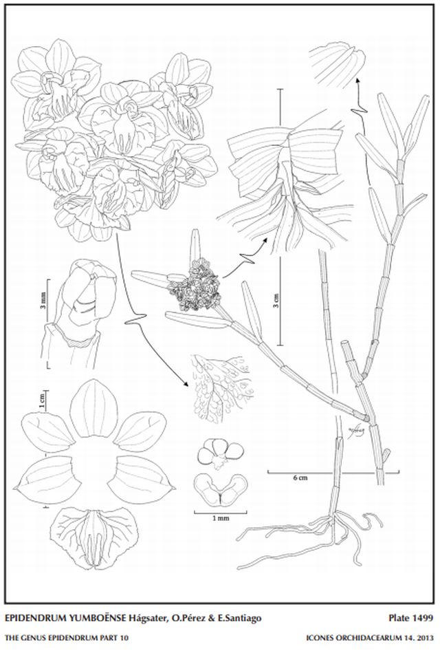 "Epidendrum yumboënse belongs to the GROUP Diothonea SUBGROUP Diothonea, characterized by the branching habit, linear-lanceolate to lanceolate, bilobed leaves, arching-nutant, racemose inflorescence, membranaceous or rarely fleshy flowers, the lip entire to 3-lobed, with an erose margin, ecallose, with or with out with 1 to 10 thin, smooth to erose keels, the column united to the lip from totally to obliquely to free. The species is recognized by the oblong-lanceolate leaves, .44 to 1.6" [1.1 to 4 cm] long, ovary ventrally inflated along the apical 2/3, forming an obvious elongate vesicle, sparsely pustulate, inflorescence with some 9, pale pink to yellow flowers, the disc orange-yellow, sepals .2 to .24" [5 to 6 mm] long, ovate-orbicular to obovate, oblique, petals ovate, wide, ca. .2 x .12" [5 x 3 mm], the lip entire, widely reniform-pentagonal, shallowly emarginate with 3 smooth keels, fused at the base, and extending to the apex. Epidendrum podocarpophilum Schltr. has pale orange flowers, the ovary is not inflated, oblong-elliptic sepals, obovate-spatulate petals and a 3-lobed lip has 3 short, rounded keels. Epidendrum caesaris Hágsater & E.Santiago has oblong-lanceolate leaves 1.52 to 3.4" [3.8 to 8.5 cm] long, inflorescence with 4 to 19 pale pink, translucent-colored flowers, ovary slightly inflated, sepals widely elliptical, .32 to .34" [8 to 8.5 mm] long, petals narrowly ovate, .28 x .0836" [7 x 2.9 mm], and a cordiform lip with 3 to 5 smooth keels than only reach the middle of the lip, and a strongly arched column. Epidendrum restrepoanum A.D.Hawkes has carmine-red flowers, the ovary is not inflated, sepals are elliptic-obovate, .24 to .36" [6 to 9 mm] long, petals narrowly elliptic, margin slightly erose, .272" [6.8 to 7.5 mm] long." Hagsater etal 2013