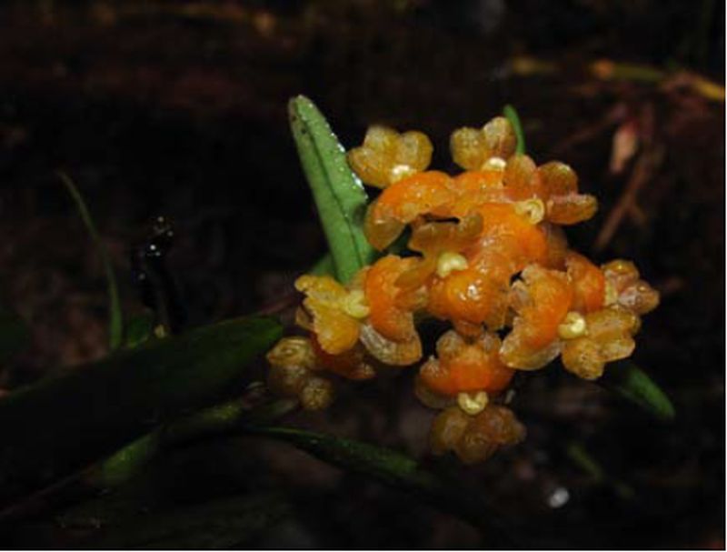 Found in southern Colombia on the western Cordillera on the Pacific slope of the Andes in cloud forests at elevations of 2000 to 2300 meters as a small to medium sized, cold growing epiphyte with terete, cane-like, thin, erect, straight, new stems branching from the sub-apical node of the previous stems carrying 6 to 7, all along the upper half of the stem, alternate, articulate, coriaceous, green with the margin tinged purple, oblong-lanceolate, truncate, bilobed, minutely aristate, margin entire leaves that blooms in the summer through fall on a terminal, without a spathe, racemose, arching-nutant, peduncle .28" [7 mm] long, rachis very short, densely simultaneously 9 flowered inflorescence with much shorter than the ovary, triangular-lanceolate, acuminate floral bracts and carrying small, resupinate, fleshy, glabrous, pustulate at the upper ends of the perianth elements, pale pink to yellow flowers with the disc orange-yellow and without fragrance data.