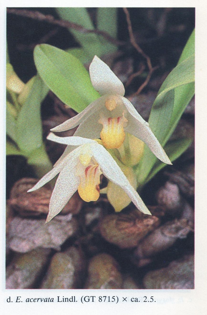 References W3 Tropicos, Kew Monocot list , IPNI ; The Orchids of Burma Grant 1895/1995; The Orchids of Sikkim-Himalaya Part 1 King & Pantling 1898 drawing good; The Orchids of Thailand Seidenfaden & Smitinand 1960 drawing fide; Contribution to a Revision of the Orchid Flora of Cambodia, Laos and Vietnam Seidenfaden 1975; Contribution to a Revision of the Orchid Flora of Cambodia, Laos and Vietnam Seidenfaden 1975 as E poilnei; Indian Orchids: A Guide to Identification Vol 2 Pradhan 1979 drawing good; Opera Botanica #62 Orchid Genera in Thailand X Seidenfaden 1982 drawing good/photo fide; Orchids of Arunachal Pradesh Hegde 1984; Identification of the Orchids [Orchidaceae Juss.] Vietnam Averyanov 1994; The Wild Orchids of China Tsi, Chen & Mori 1997 photo fide; Native Orchids of China in Colour Singchi, Zhanhuo and Yibo 1999 photo fide; A field Guide to the Wild Orchids of Thailand Vaddhanaphuti 2001 photo ok; Orchids of Bhutan Pearce & Cribb 2002; A field Guide to the Wild Orchids of Thailand Vaddhanaphuti 2005 photo fide; Genera Orchidacearum Vol 4 part 1 Pridgeon, Cribb, Chase and Rasmussen 2005; The Orchids of India A Glimpse Misra 2007 drawing ok; A Field Guide to the Orchids of China Singchi, Zhongjian, Yibo, Xiaohua and Zhanhuo 2009 photo ok; Flora of China Vol 25 Zhengyi, Raven & Deyuan 2009 as Pinalia acervata; Mille et Une Mini Orchideees Roguenant 2009 photo ok; Flora of China Vol 25 Zhengyi, Raven & Deyuan 2010 Pinalia acervata drawing not; The Wild Orchids in Yunnan Xu Xiang Ye & Liu 2010 as Pinalia acervata photos om; Wild Orchids in Thailand 2 Vadhanaphuti 2014 photo good; Turczaninowia 19 (3): 5–58 L. V. Averyanov, Khang Sinh Nguyen etal 2016 ; Atlas of Native Orchids of China Vol 2 Jin Xiaohua, Li Jianwu and Ye Deping 2019 as Pinalia acervata photo fide;
