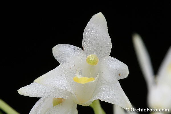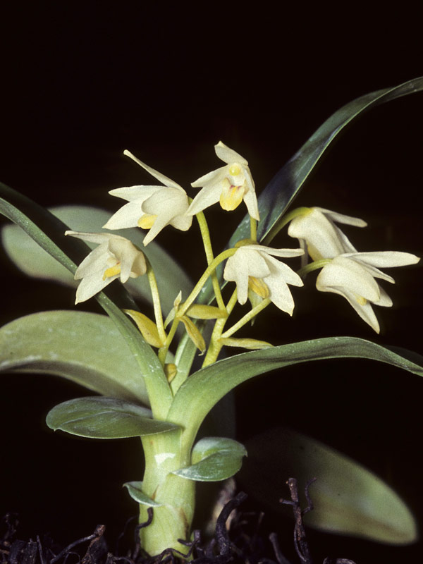 Found in Yunnan province of China, Assam, eastern Himalayas, Myanmar, Thailand, Laos, Cambodia and Vietnam in semi-deciduous and deciduous dry lowland forests and savana-like woodlands at elevations of sea level to 600 meters and primary montane forests at elevations of 900 to 3350 meters as a miniature to small sized, warm to cold growing epiphyte with ellipsoid to flask-like, grooved, flattened when closely clustered pseudobulbs carrying 3 to 5, oblanceolate-flaccid, obtuse to acute, pale green, many nerved leaves that blooms in the fall on a slender 2 to 3" [5 to 7.5 cm] long, glabrous, several [15] flowered inflorescence.