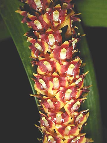 Found in Java, Sumatra and Borneo as a medium sized, cool to warm growing epiphyte with stem-like, terete pseudobulbs enveloped basally by 4 acute, fleshy sheaths and carrying 6, linear-lanceolate, gradually narrowing to the acute apex, slightly fleshy leaves that blooms in the spring and summer on an axillary, erect to slightly curved, to 12" [30 cm] long, densely many flowered, shortly white pubescent inflorescence with oblong, acute, reflexed floral bracts.