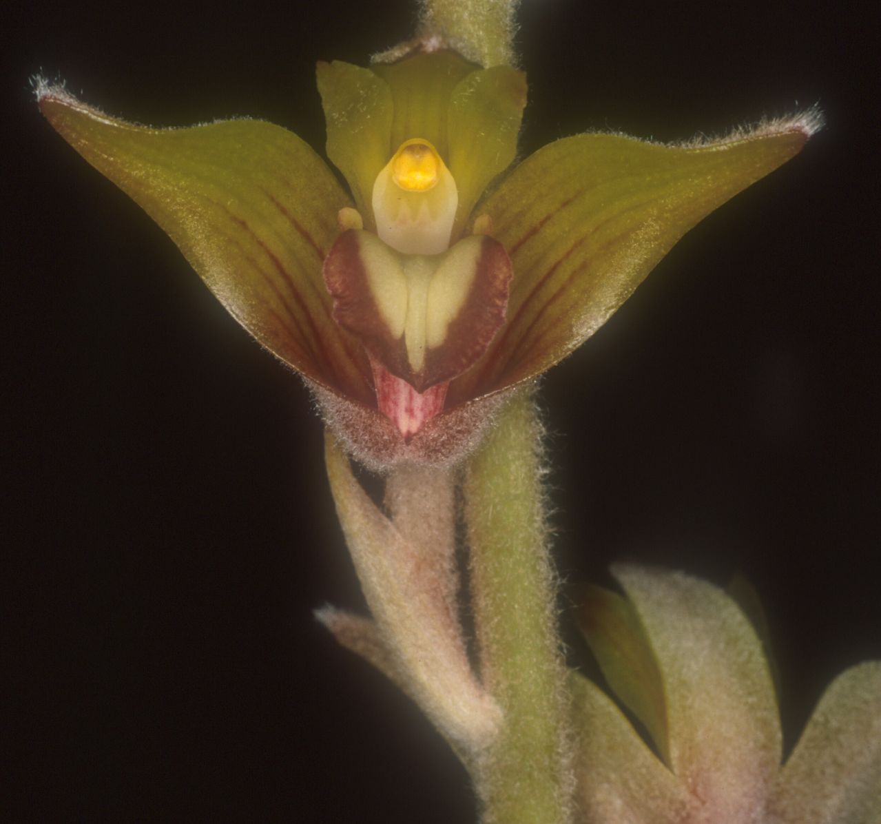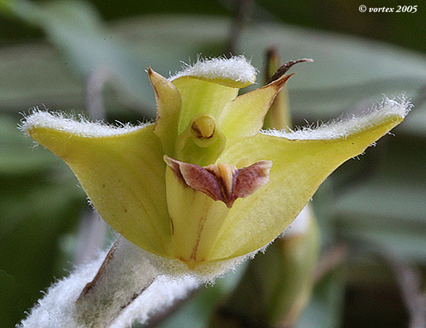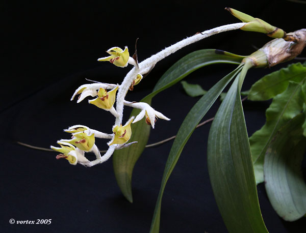 A musky scented, small sized, hot to cool growing epiphyte or terrestrial in poor soil and light shade found on the island of Java as well as Myanmar, Thailand, Laos, Cambodia, Vietnam, Sumatra and the Malaysian penninsula in evergreen lowland forests at elevations of 50 to 1500 meters with pseudobulbs that carry 3 to 4, lanceolate, tough, leathery leaves that blooms in the fall on a basal, erect to arcuate, to 8 to 12" [20 to 30cm] long, many [8 to 15] flowered, racemose inflorescence having a few scale like bracts with wool like hairs covering them.