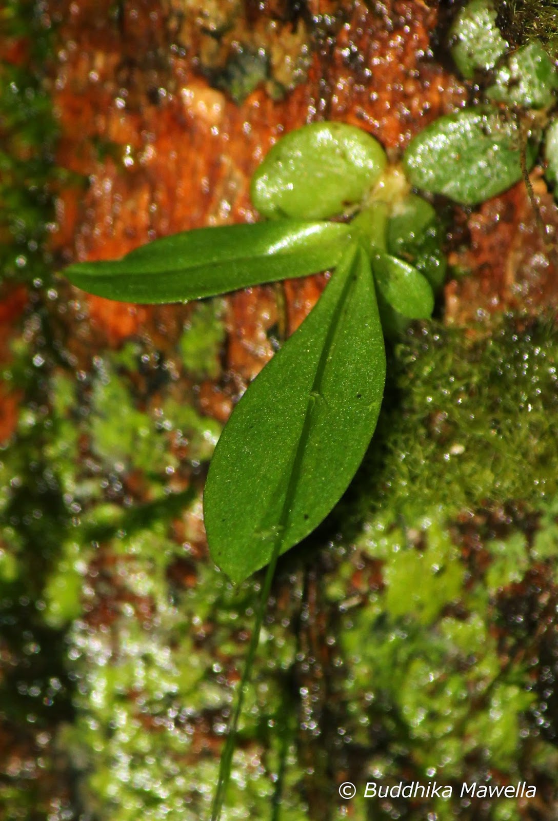 Found in Sri Lanka in tropical, wet, evergreen forests at elevations below 600 meters as a mini-miniature sized, hot to warm growing epiphyte with a thin rhizome giving rise to small, subglobose to ellipsoid, adhering end to end to form a chain, smooth pseudobulbs carrying a single to rarely 2, apical, sessile, membraneous, dark green, elliptic-ovate, apiculate, 5 veined leaf that blooms in the later winter on a terminal, pendent, long flexuous, zig-zag, 1 to 3" [2.5 to 7.5 cm] long, successively few, several flowered inflorescence with very small, membraneous, cymbiform floral bracts and carrying smallorange-salmon colored flowers.