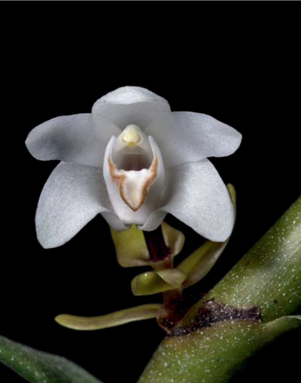 Found in the Philippines on Mindanao Island on mossy branches at elevations around 1200 meters as a giant sized, cool growing epiphyte with a cylindrical, erect, elongate, stem-like pseudobulb up to 40" [1 meter] long, carrying lanceolate to linear-lanceolate, apex acute-acuminate, glabrous, entire, fleshy, acute base leaves that blooms in the late winter and early spring on short, axillary, peduncle short, stout, terete, glabrous, .08" [2 mm] long, single-flowered inflorescence bearing 3 to 5 cucullate flowers within cavities on the pseudobulb, all opening at the same time and the flowers do not open widely.