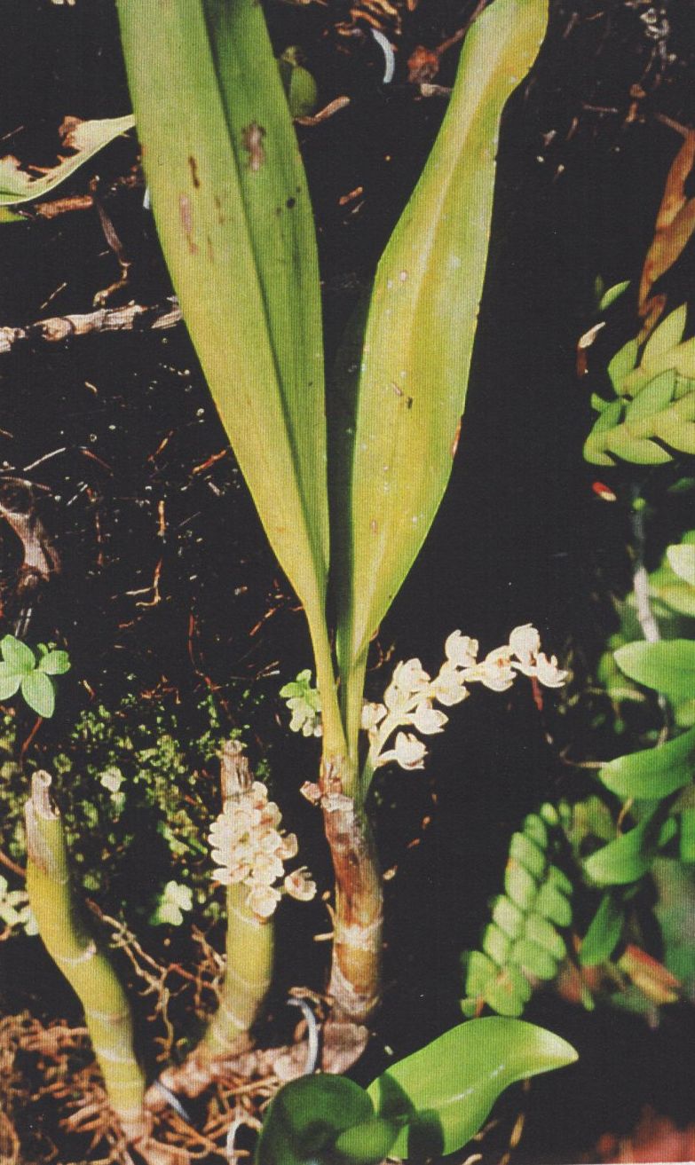 Found in penninsular Malaysia, Java and Sumatra in primary forests at elevations of sealevel to 500 meters as a small sized, hot to warm growing epiphyte with a stem carrying several, papery, evanescent sheaths and 2 apical, narrowly lanceolate, gradually narrowing below into the petiolate base leaves and blooms in the late winter and early spring on a from near the apex, erect, pubescent, 2 5/8" [6.5 cm] long inflorescence arising on young stems with ovate, obtuse floral bracts and to 10, non resupinate flowers
