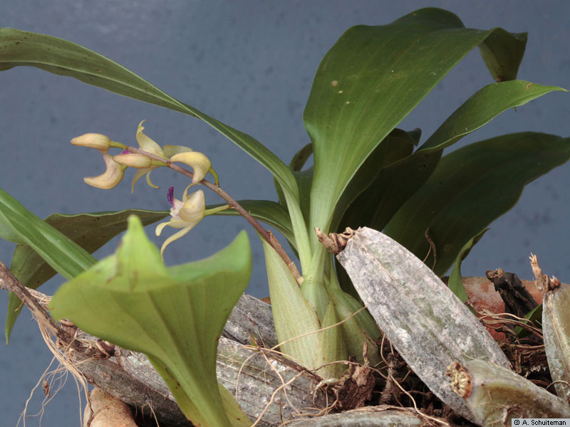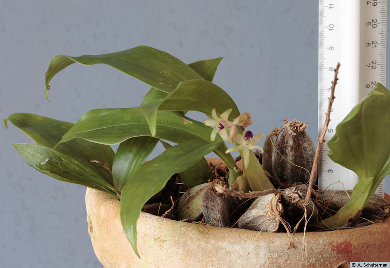 Found in Yunnan province of China, Laos and Vietnam at elevations of 750 to 1600 meters as a creeping, miniature sized, warm to cool growing epiphyte or lithophyte on mossy rocks and vertical cliffs with close set, ovoid pseudobulbs carrying 2, oval, petiolate base leaves that blooms in the late summer and fall on a very short, 4" [10 cm] long, arising from the upper nodes, few flowered inflorescence
