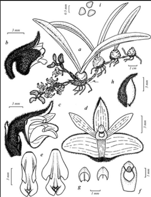 Found in Vietnam on very steep rocky slopes and rocky tops of highly eroded marble-like solid remnant limestone mountains at elevations of 600 to 1300 meters as a mini-miniature sized, warm to cool growing epiphyte with a creeping rhizome giving rise to globose, becoming rugose with age pseudobulbs carrying 2, apical, erect, oblanceolate, acute to obtuse, conduplicate below into the base leaves that blooms on 2, basal, lateral, 1.2 to 2" [3 to 5 cm] long, 4 to 6 flowered inflorescence.