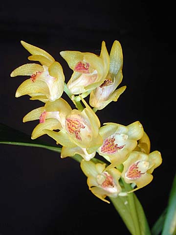 Found in the eastern Himalayas, Assam, Bhutan, southern China and Vietnam in montane, humid, mossy, mixed and coniferous forests and primary montane forests at elevations of 500 to 2000 meters as a miniature to small sized, cool to warm growing epiphyte, lithophyte or terrestrial orchid with ovoid-ellipsoid, blunt apically, rugose pseudobulbs, enveloped below by fibrous sheaths and carrying 2, apical, elliptic-lanceolate, acute to acuminate, membraneous, grooved petiolate base leaves that blooms in the late winter and spring on a 1 to 2, terminal, racemose, 1.2 to 2" [3 to 5 cm], laxly 5 to 9 flowered, slightly fractiflex inflorescence enveloped below by lanceolate, acute sheaths.