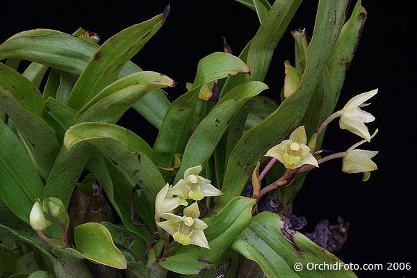 Found in Myanmar and Thailand at elevations around 500 meters as a small sized, hot to warm growing epiphyte with fusiform, 4 to 5 noded pseudobulbs enveloped in youth by truncate, cupular, imbricating sheaths and carrying towards the apex, linear-lanceolate, very narrow, rather membraneous leaves that blooms in the late spring and early summer on a suberect, very slender, pubescent, 2 to 6 flowered inflorescence with small, ovate-lanceolate, acute floral bracts.