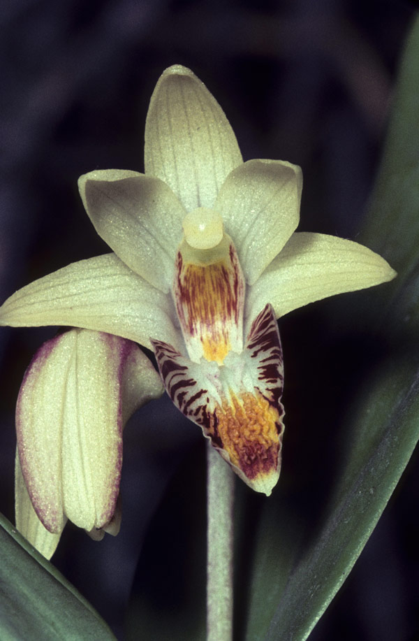 Found in the eastern Himalayas, Assam, Nepal, Bhutan, Myanmar, Thailand, southern China and Vietnam in semi-deciduous and evergreen forests at elevations of 500 to 2300 meters as a miniature to medium sized, warm to cold growing epiphyte or lithophtye on mossy limestone rocks with fleshy, naked, narrowly cylindric pseudobulbs that are pea-green becoming ash-gray and blackening with age carrying a few, lax, pubescent, basal sheaths and 2 apical, broadly lanceolate, coriaceous to fleshy, smooth, pale green leaves all arising from a subterranean soft rhizome. The 2, towards the apex, ovate-lanceolate, acuminate, coriaceous leaves give rise to a terminal, erect or arching, 6" [15 cm] long, loosely 3 to 6 flowered inflorescence with large, narrowly lanceolate floral bracts and several [2 to 6] fragrant, waxy, slightly nodding flowers that blooms in the spring.
