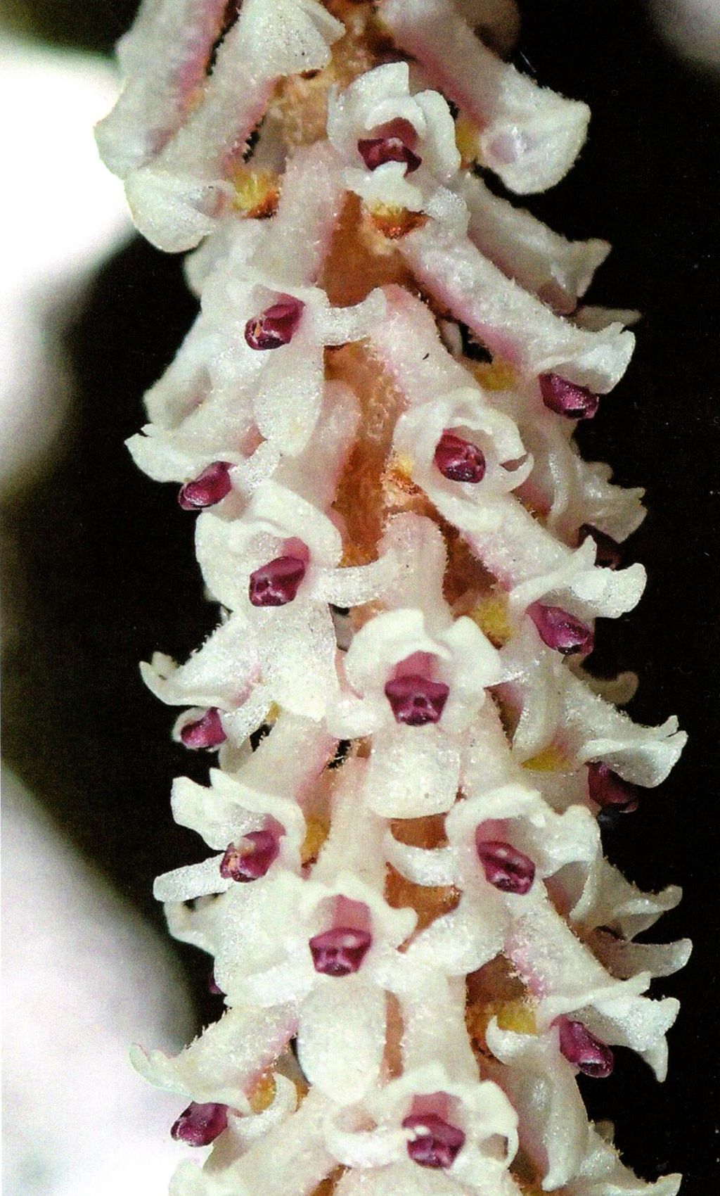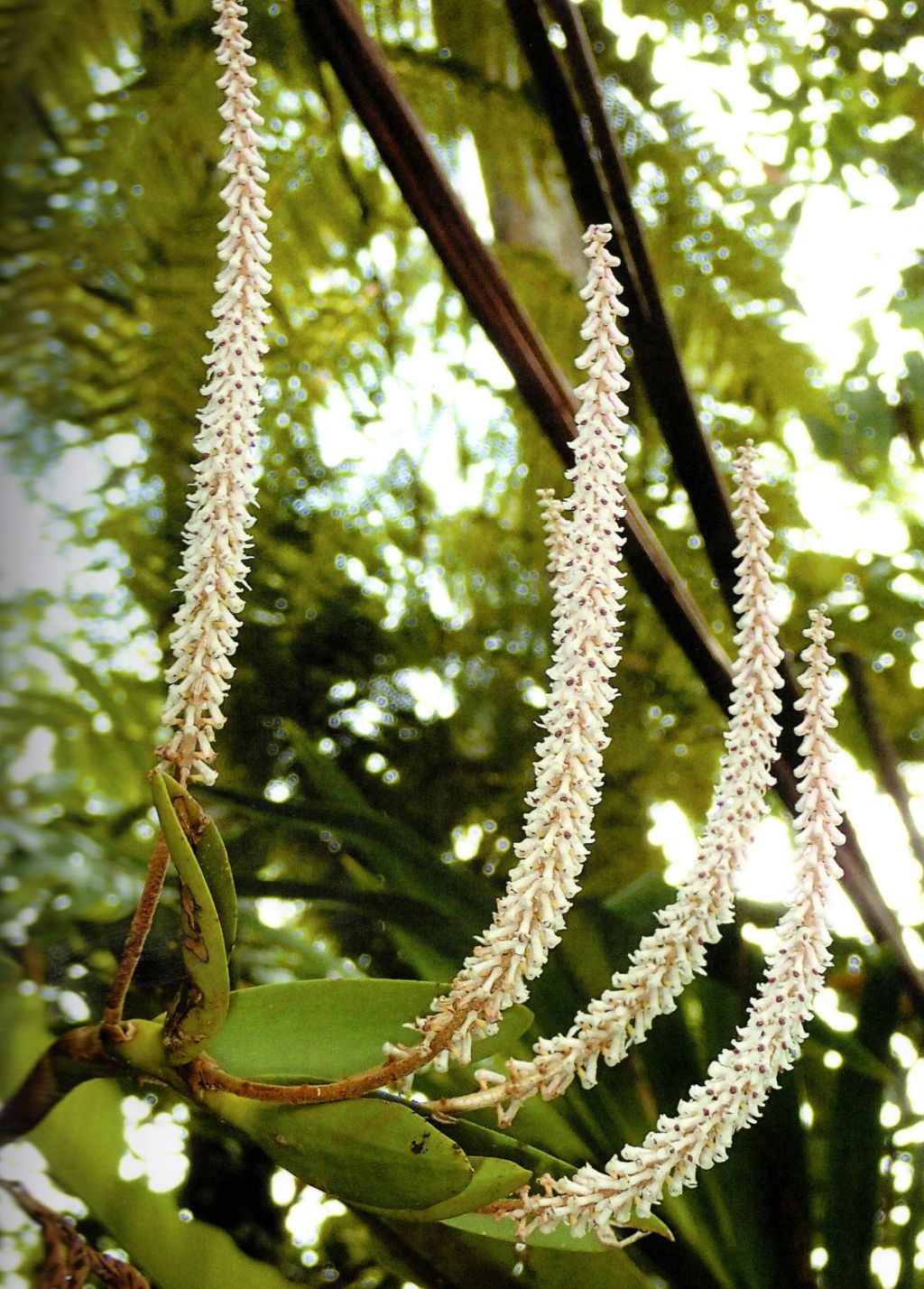 Found in Sabah Borneo in hill primary forests at elevations around 700 meters as a medium sized, warm growing epiphyte with erect, clustered, cylindrical, broadening slightly towards the apex, green to yellow brown, slightly compressed, rather fleshy pseudobulb, 5 to 7 internoded below the leaves each with a single persistent sheath carrying 4 to 6, on the distal 1.6 to 2.4" [4 to 6 cm] of the stem, elliptic, slightly cupped, green, thick, very stiff, leathery, obtuse to subacute, gradually narrowing into the basally clasping leaves that blooms in the summer on several per newly formed stem, laterally through sheaths amongst the leaves, ascending, peduncle 1.04 to 2" [2.6 to 5 cm] long, green brown to pale maroon, densely covered in short, orange hairs, provided with one large basal bract and several small sterile bracts below the rachis, rachis 4.4 to 6" [11 to 15 cm] long, 5.2 to 7.2" [13 to 18 cm] long overall, simultaneously half, to 120 flowered inflorescence with ovate-rectangular, obtuse, apiculate, covered with long branched hairs, shorter than the ovary floral bracts and carrying non-resupinate flowers.