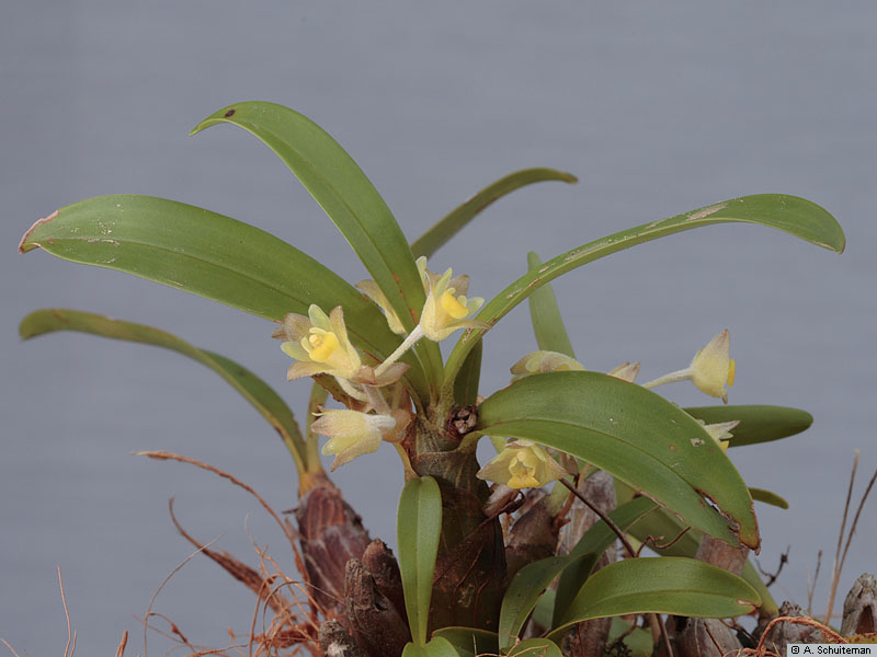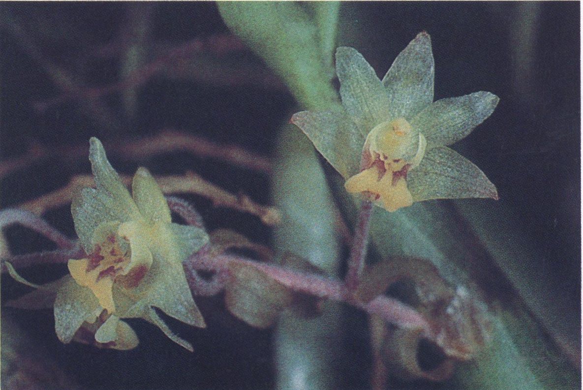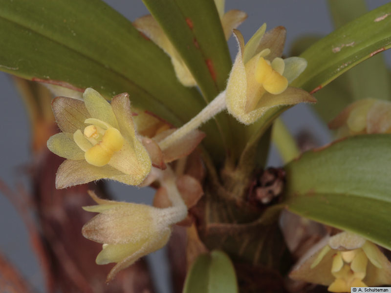 Found in Myanmar at elevations around 1000 to 1400 meters as a mini-miniature sized, cool growing epiphyte with a short, cylindric pseudobulb partially enveloped by several dark red brown leaf bearing sheaths carrying 2 to 3, apical, narrowly oblanceolate, obtuse, basally clasping leaves that blooms from the nodes near the apex of the cane with short, 3 to 4 flowered, downy white inflorescence with inflated, broadly ovate, apiculate, brownish bracts.