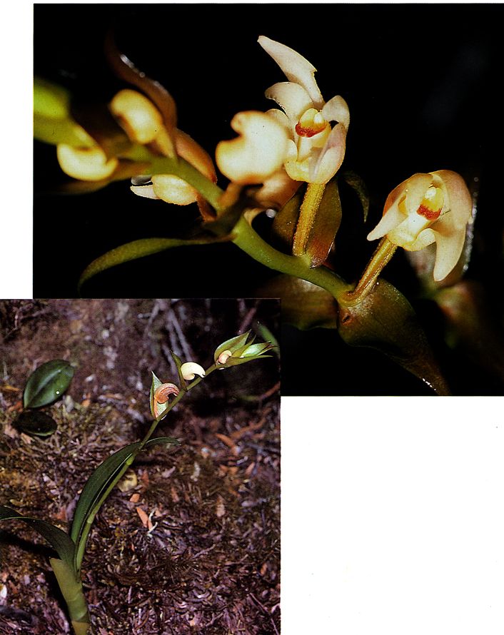 Found only in Malaysia in highlands as a small sized, cool growing epiphyte with a short, fleshy, thick, flattened, elongate stem with 3 to 5, foliaceous, yellowish green sheaths and carrying 2 to 3, stalked, oblong to oblanceolate, acute leaves that blooms on 1 to 2, axillary, erect, long pedunculate, 16.8" [42 cm] long overall, several flowered inflorescence with large, conspicuous, ovate to broadly lanceoalte, acute, green flushed with purple floral bracts.