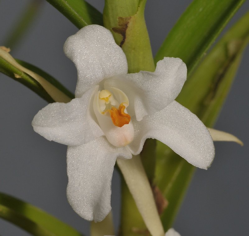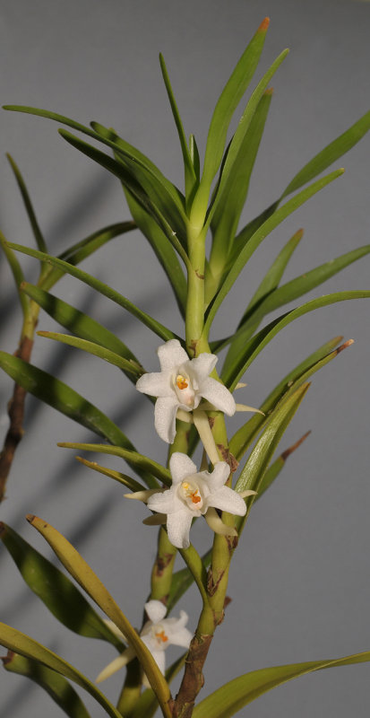 Found in Quezon province of the Philippines at elevations of 350 to 600 metrs as a medium to large sized, hot to warm growing epiphyte with many slender, erect, leafy stems carrying several light green, linear, acute leaves that blooms on several, short, to .2" [5 mm] long, opposite the leaves, single flowered inflorescence with 5 lovely, pale yellow bracts carrying short lived, sweetly fragrant flowers that can bloom at most any time of the year and is most likely triggered by a cool rain.