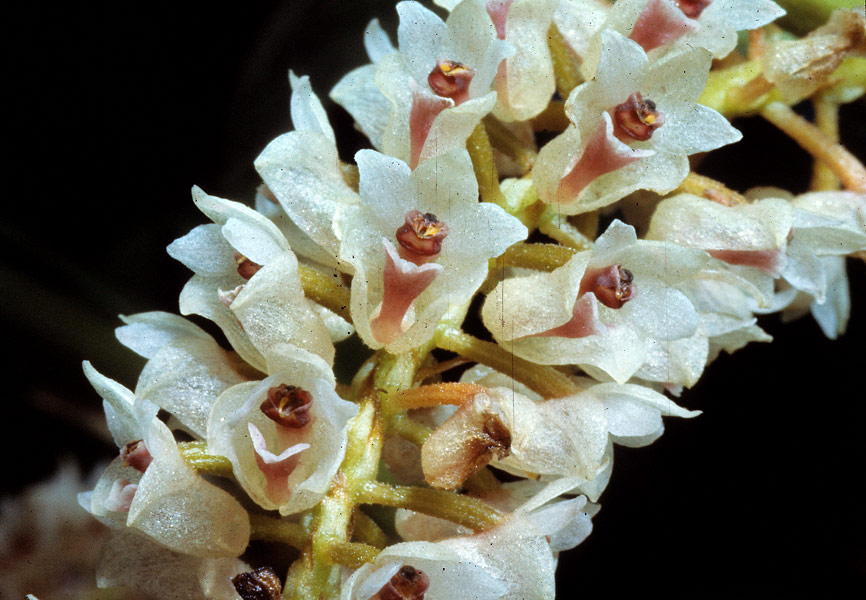 Found in Java at elevations above 760 meters as a medium sized, warm to cool growing epiphyte with close set, thickest at the base, tepering towards the apex stems carrying gradually narrowing towards the base leaves that blooms on 2 to 6 per stem, terminal to subterminal, to 4" [10 cm] long,shorter than the leaves, erct basally then slightly arching, brown pubescent, many flowered inflorescence.