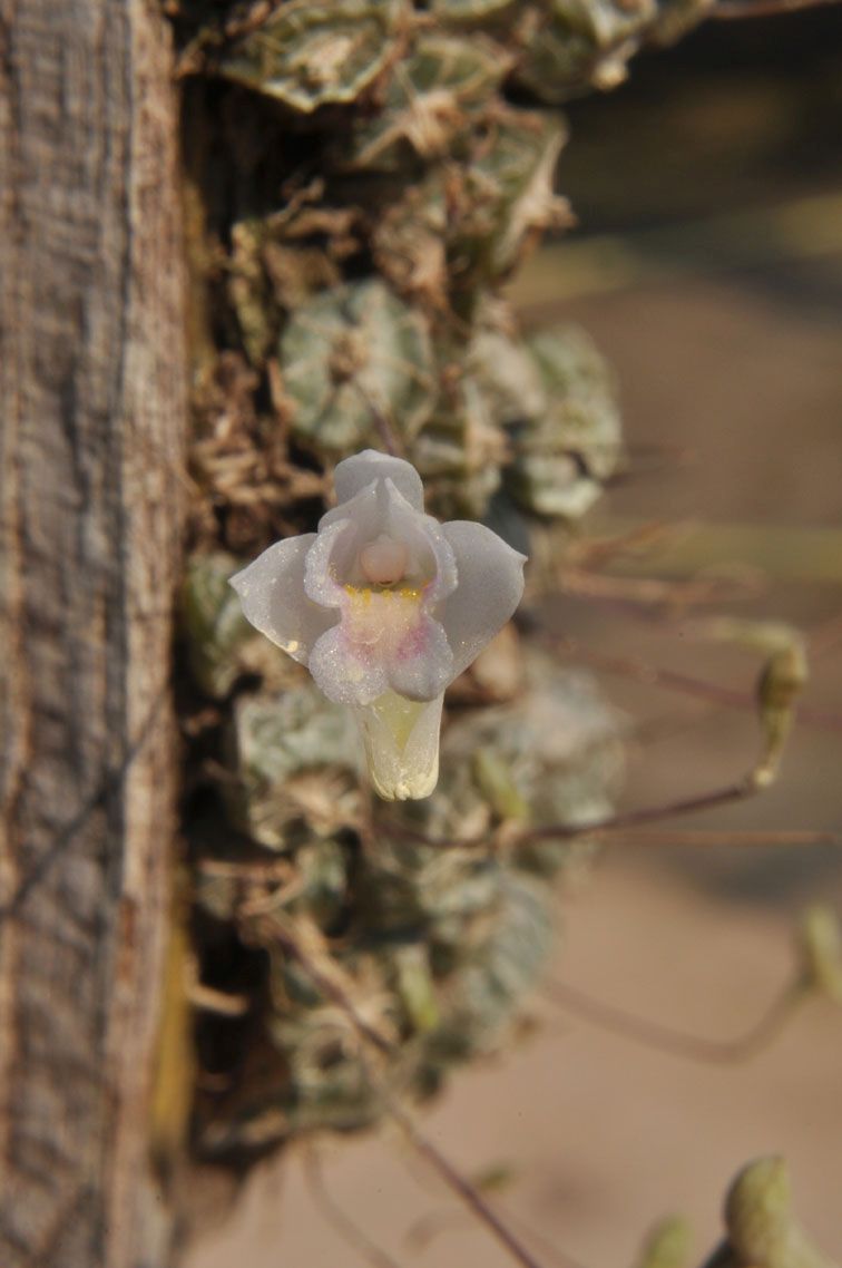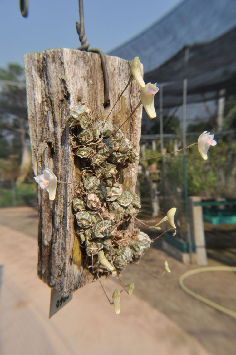 Found in Nepal and Myanmar with clumping, globose, flattened, depressed on top, wrinkled pseudobulbs giving rise to an ovate, deciduous, acute leaf that blooms in the spring on a terminal, erect, slender, 2 to 2.4” [5 to 6 cm] long, single flowered inflorescence arising on pseudobulbs that have dropped their leaves