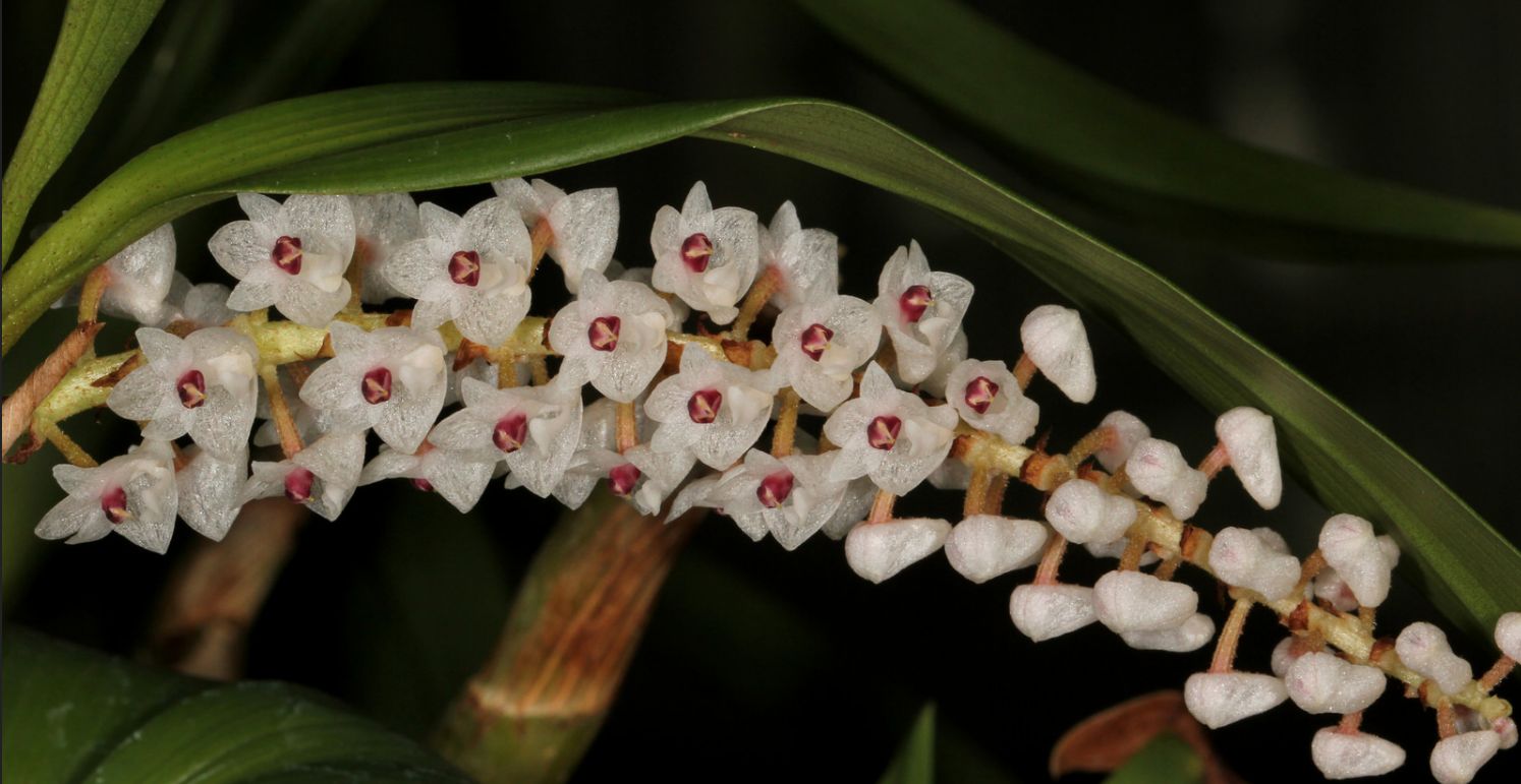Found in Myanmar, penninsular Thailand, Vietnam, Malaysian penninsula, Sumatra, Java, Borneo and the Philippines in primary montane forests as a small to medium sized, warm to cold growing epiphyte on large trees along streams at elevations of 500 to 2400 meters with erect, stem-like, narrowly ellipsoid pseudobulbs carrying 2 to 5, apical, linear-lanceolate to elliptic, acute, soft leaves that blooms in the spring on an axillary, 8" [20 cm] long, densely many flowered, racemose inflorescence that arise, several at a time, from the nodes on the upper half of the pseudobulb.